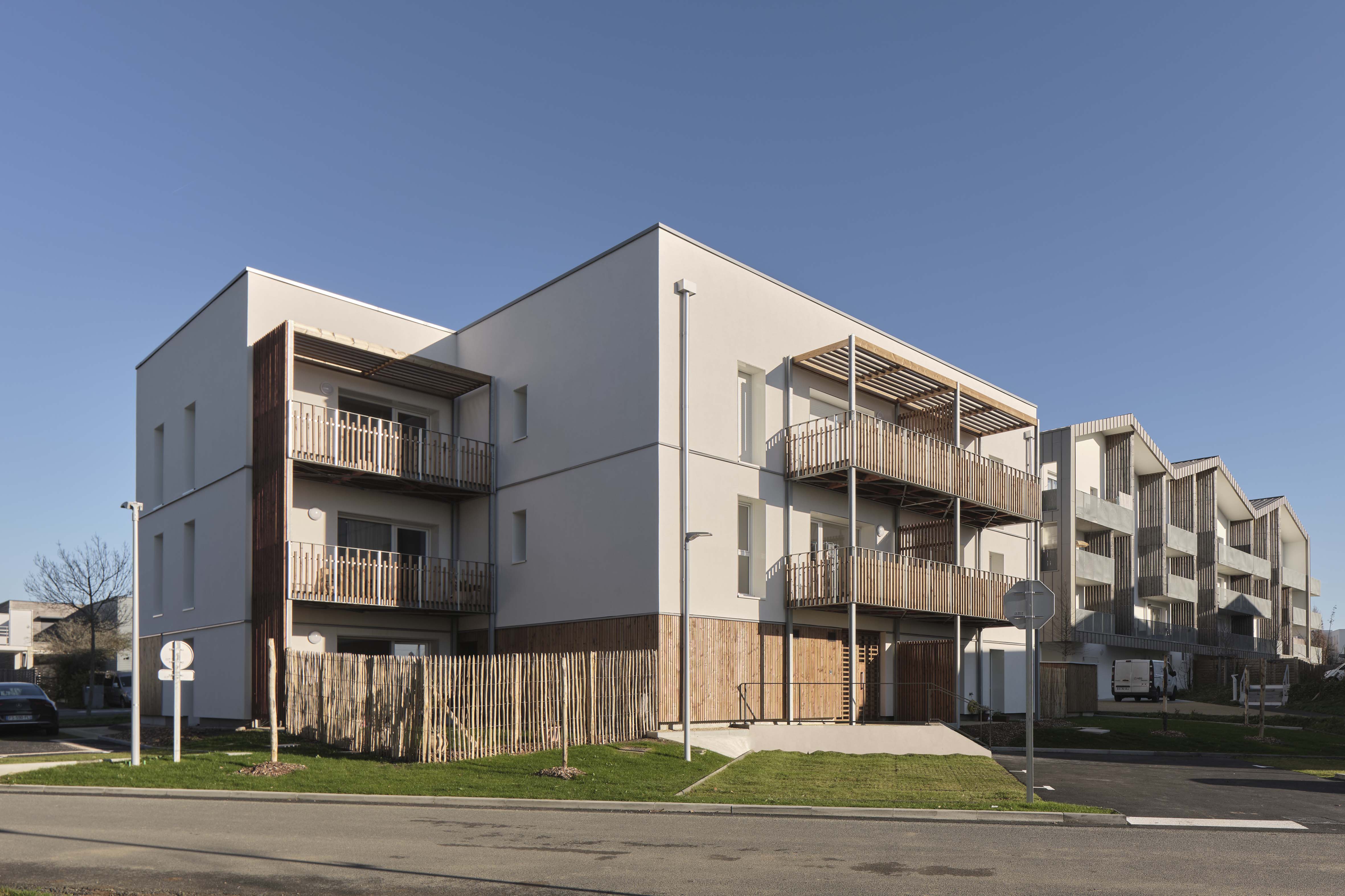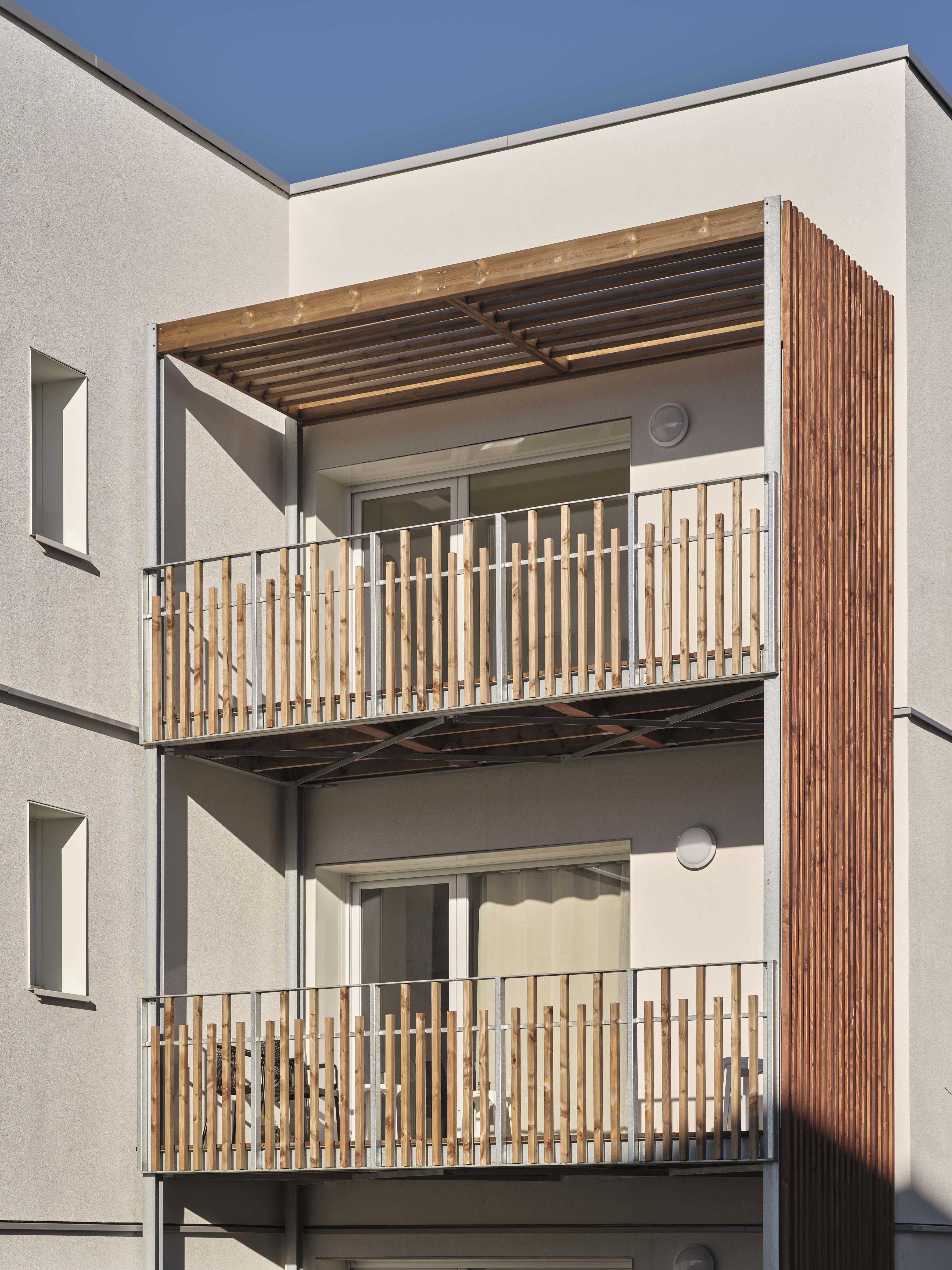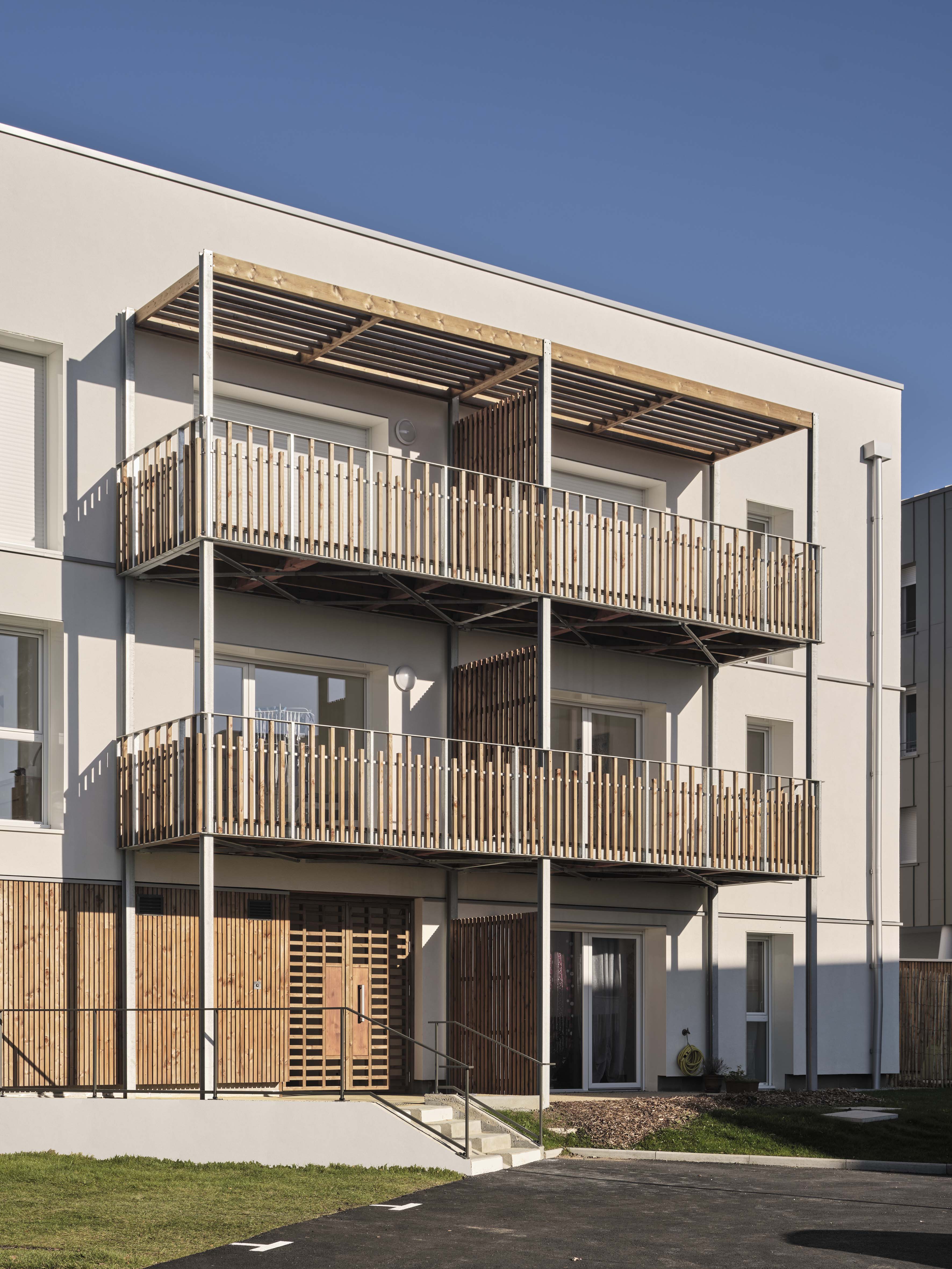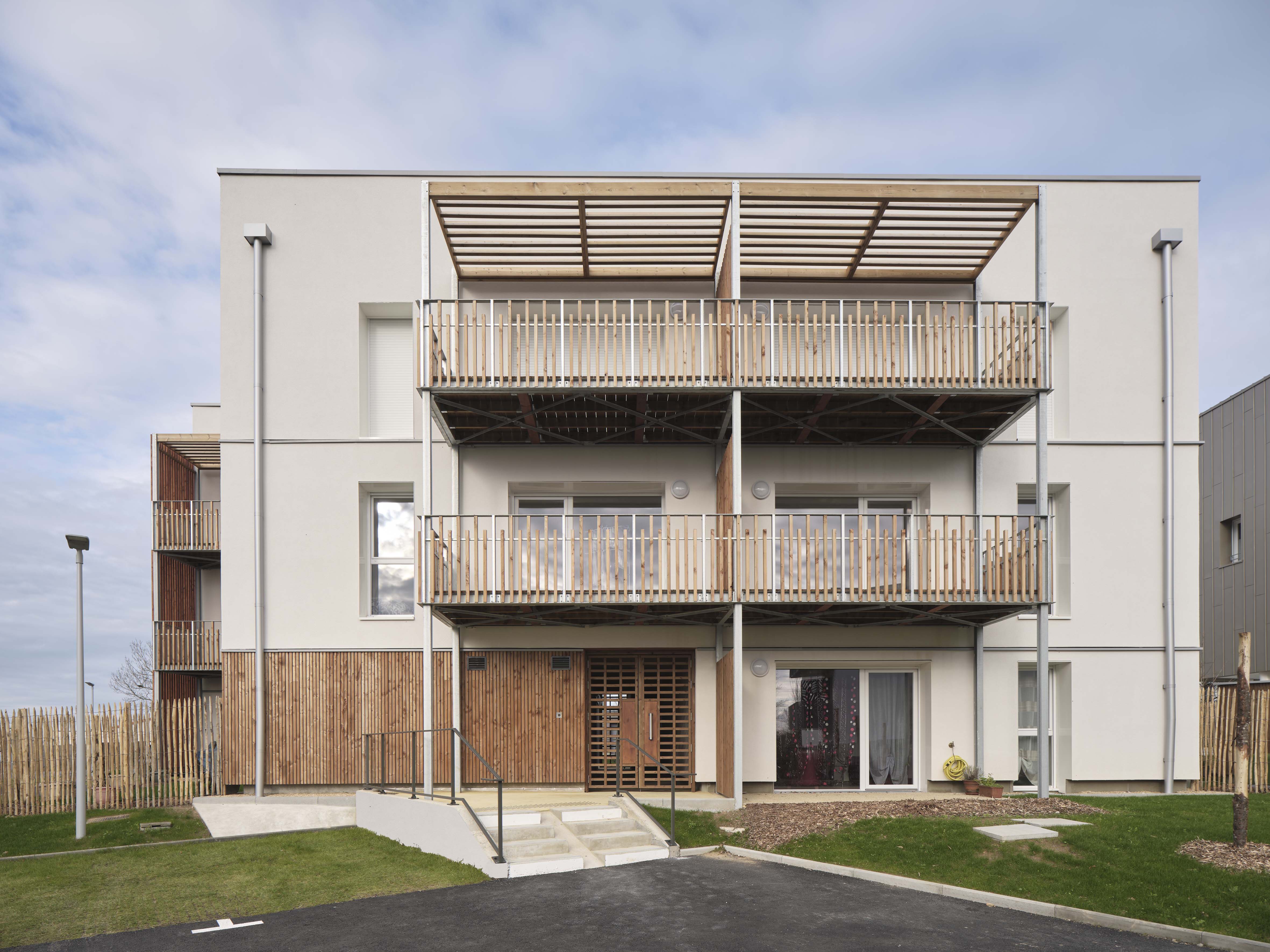 Cette opération de 11 logements s’organise autour d’une cour centrale qui abrite les circulations verticales. Les logements sont desservis par une coursive abritée. L’organisation générale permet une bonne compacité des logements et une volumétrie simple. Toutes les pièces de vie profitent d’une orientation sud. La disposition des terrasses permet une intimité maximale. La particularité de cette opération est d’être conçue avec des murs en bois paille. La paille est fournie par un producteur local. Les performances atteintes que ce soit sur le plan thermique comme pour la décarbonisation sont exceptionnelles. La paille assure également un excellent confort d’été grâce au déphasage.