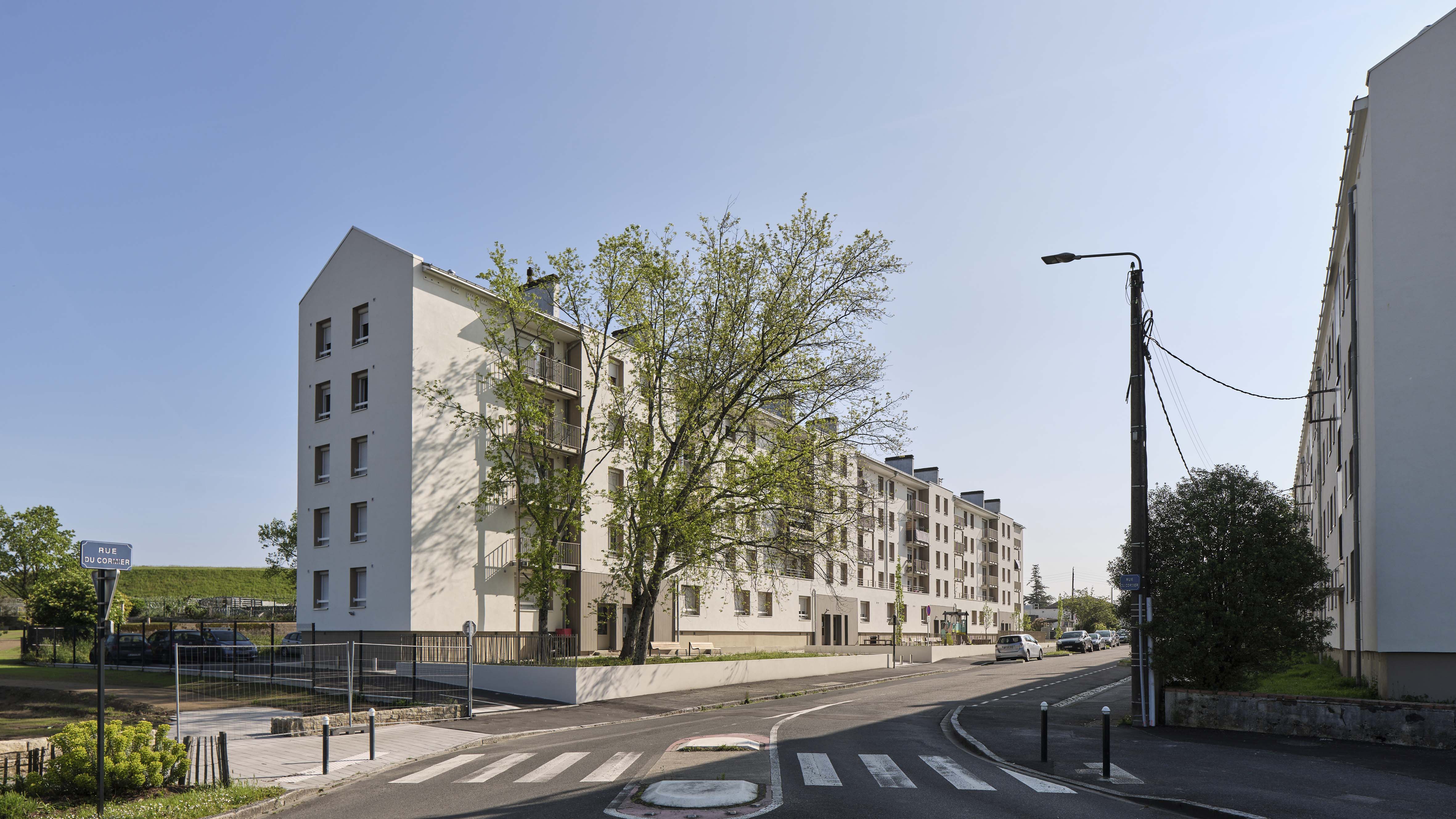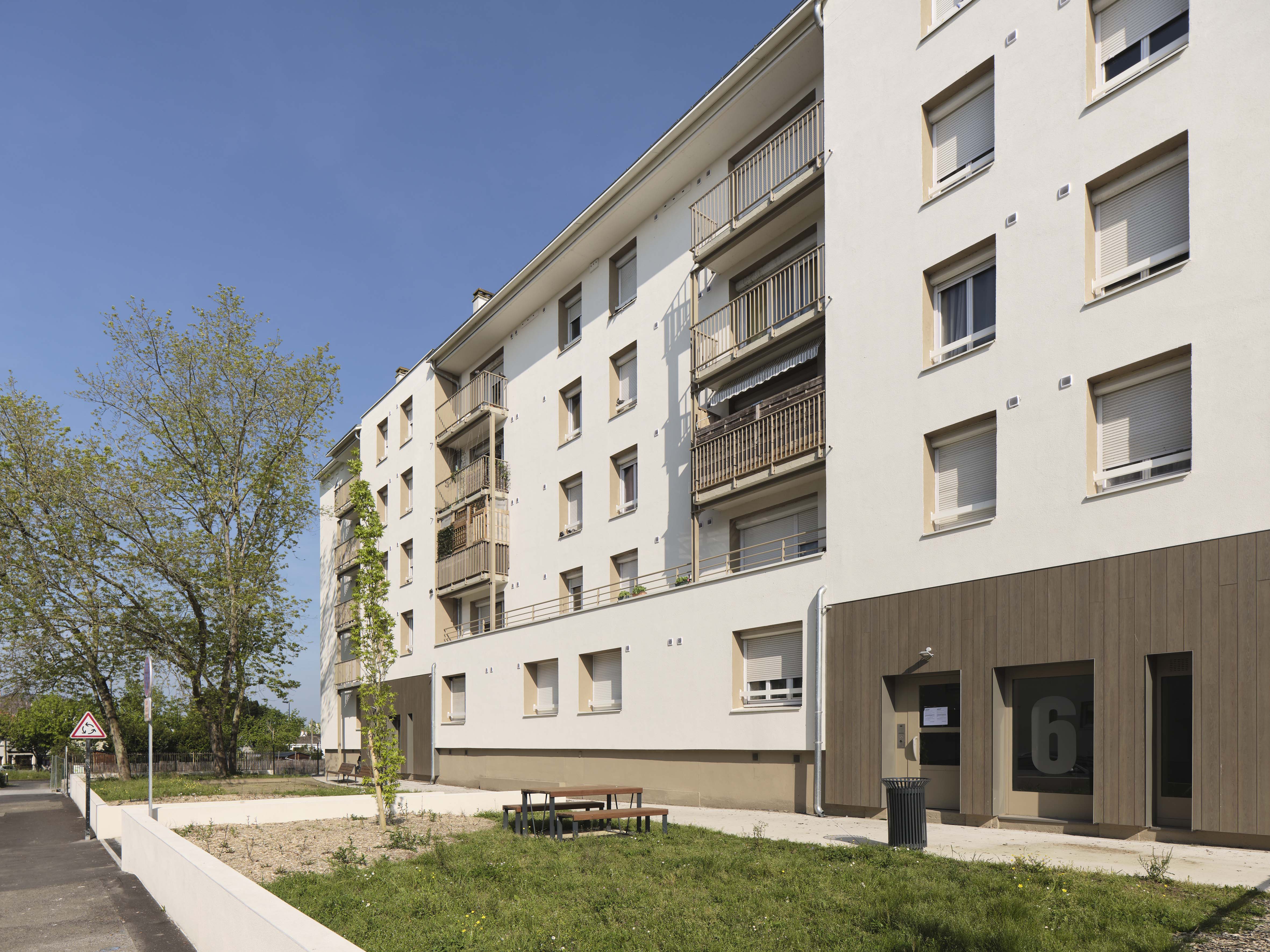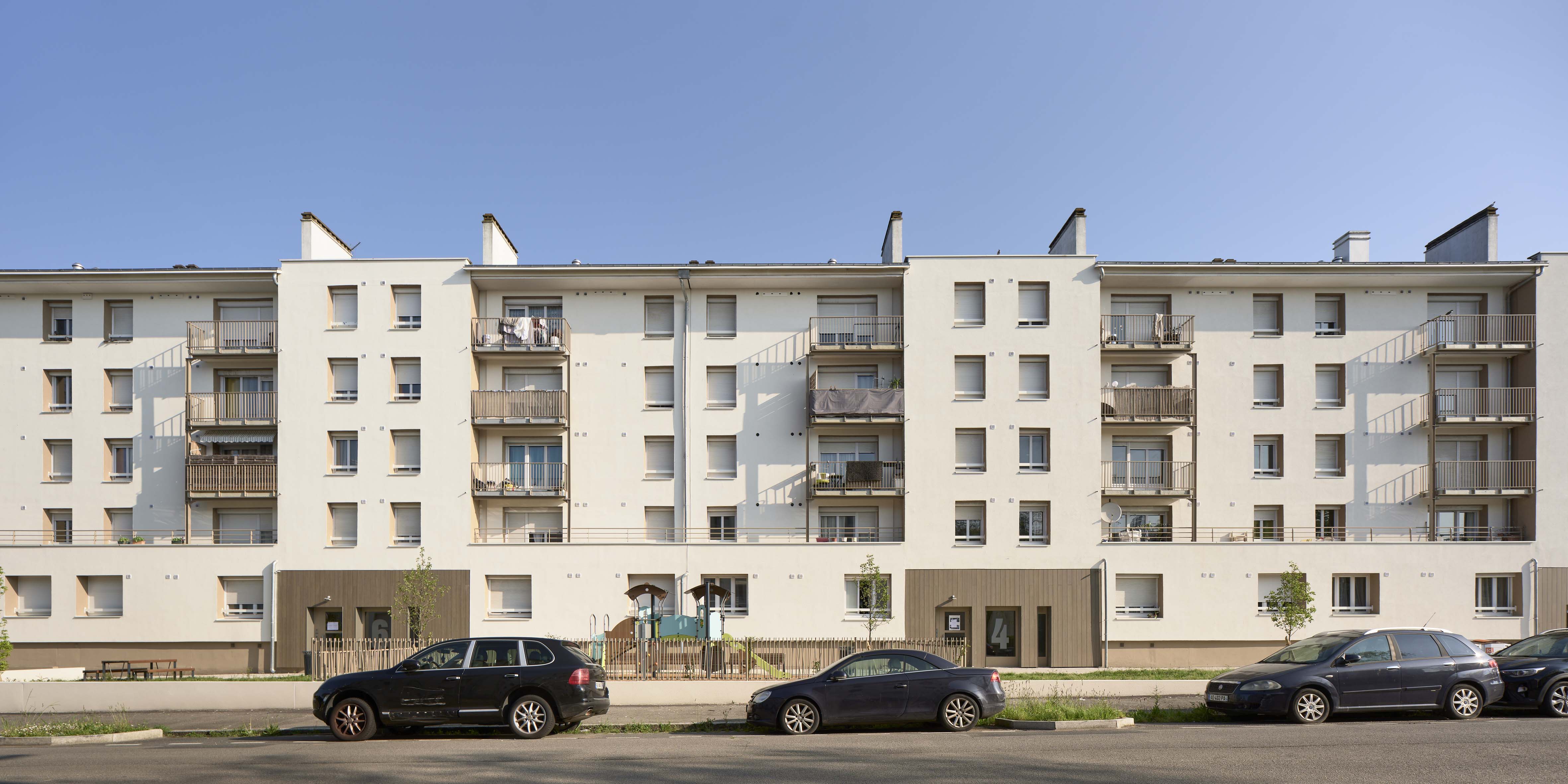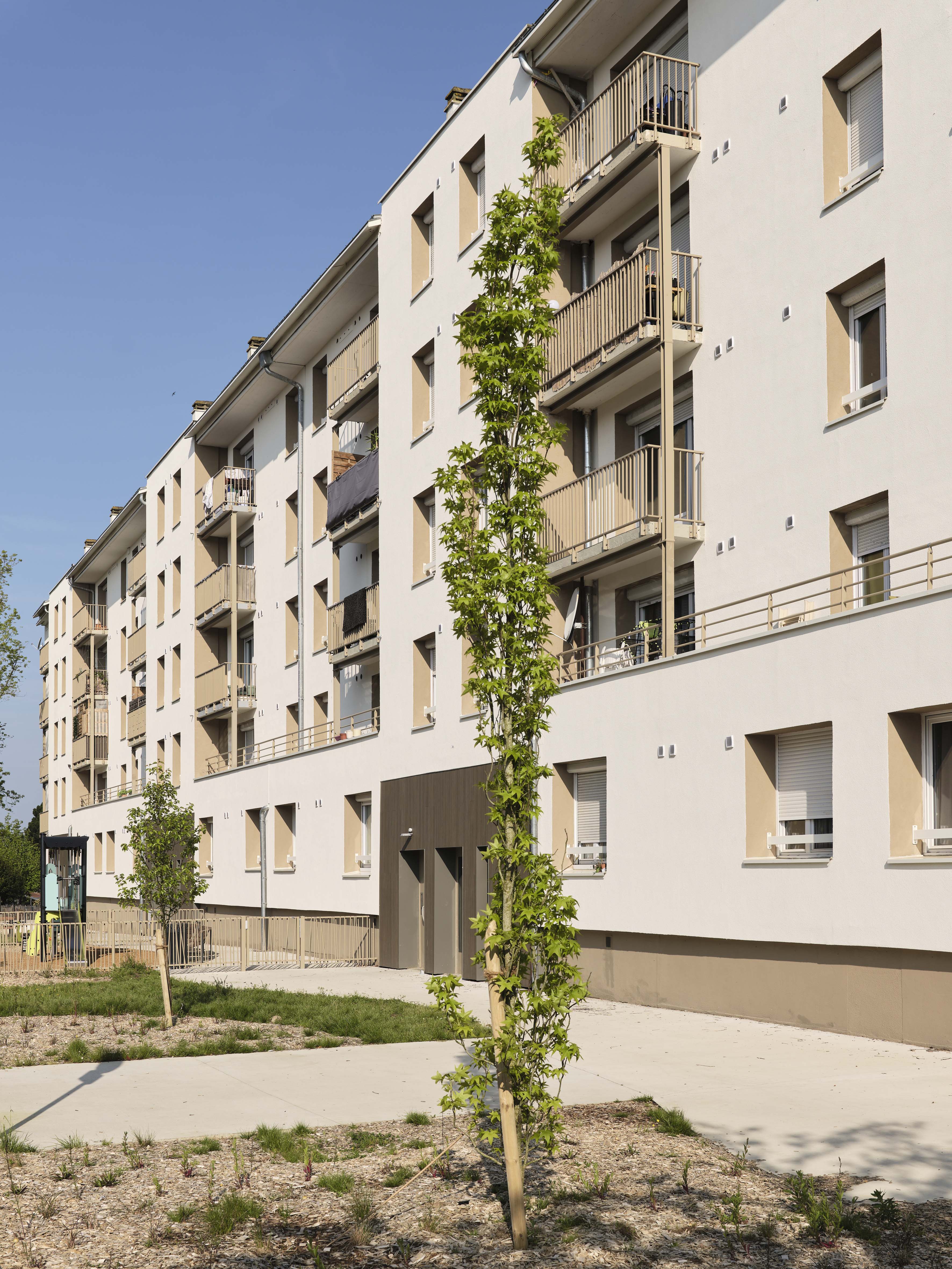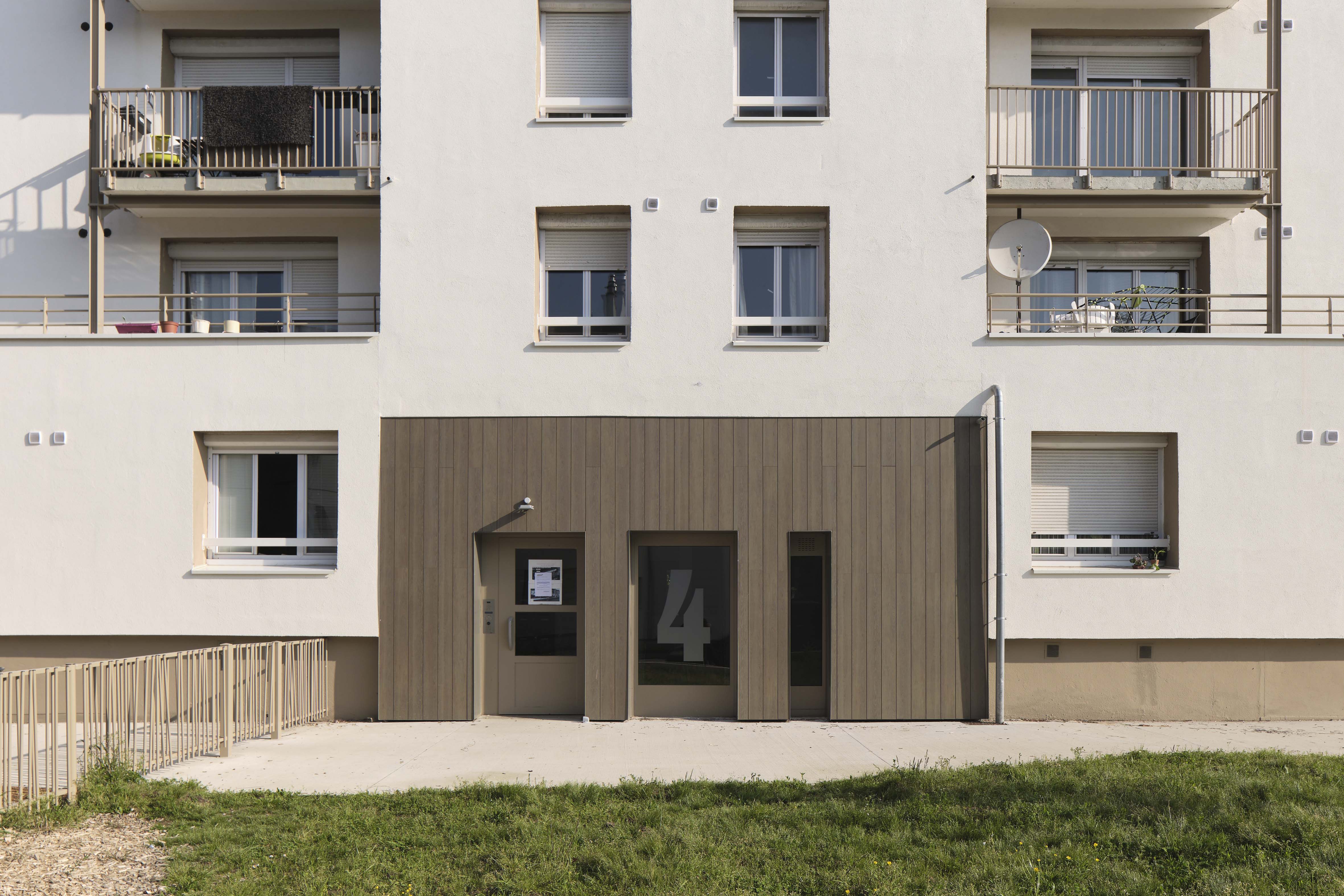 Le projet consiste en la requalification de 76 logements collectifs et 5 commerces sont également transformés en logements. La rénovation des façades a pour but de redonner de l’attrait à ces 76 logements dans ce quartier qualifié de peu valorisant pour les locataires. Sur le plus grand bâtiment, les frontons sont déposés et un bardage bois vient marquer l’entrée de chaque cage. Sur le bâtiment d’en face, c’est du zinc brun qui vient valoriser chaque entrée d’immeuble. Sur les deux petits immeubles, les pignons sont recouverts de bardage bois également. Une résidentialisation accompagne également la valorisation des façades : un parvis piéton remplace le parking le long des commerces en façade sud du grand immeuble. Le parking passe au nord. Des espaces pour enfants, pour ados et pour des moments familiaux sont dispersés sur le site.
