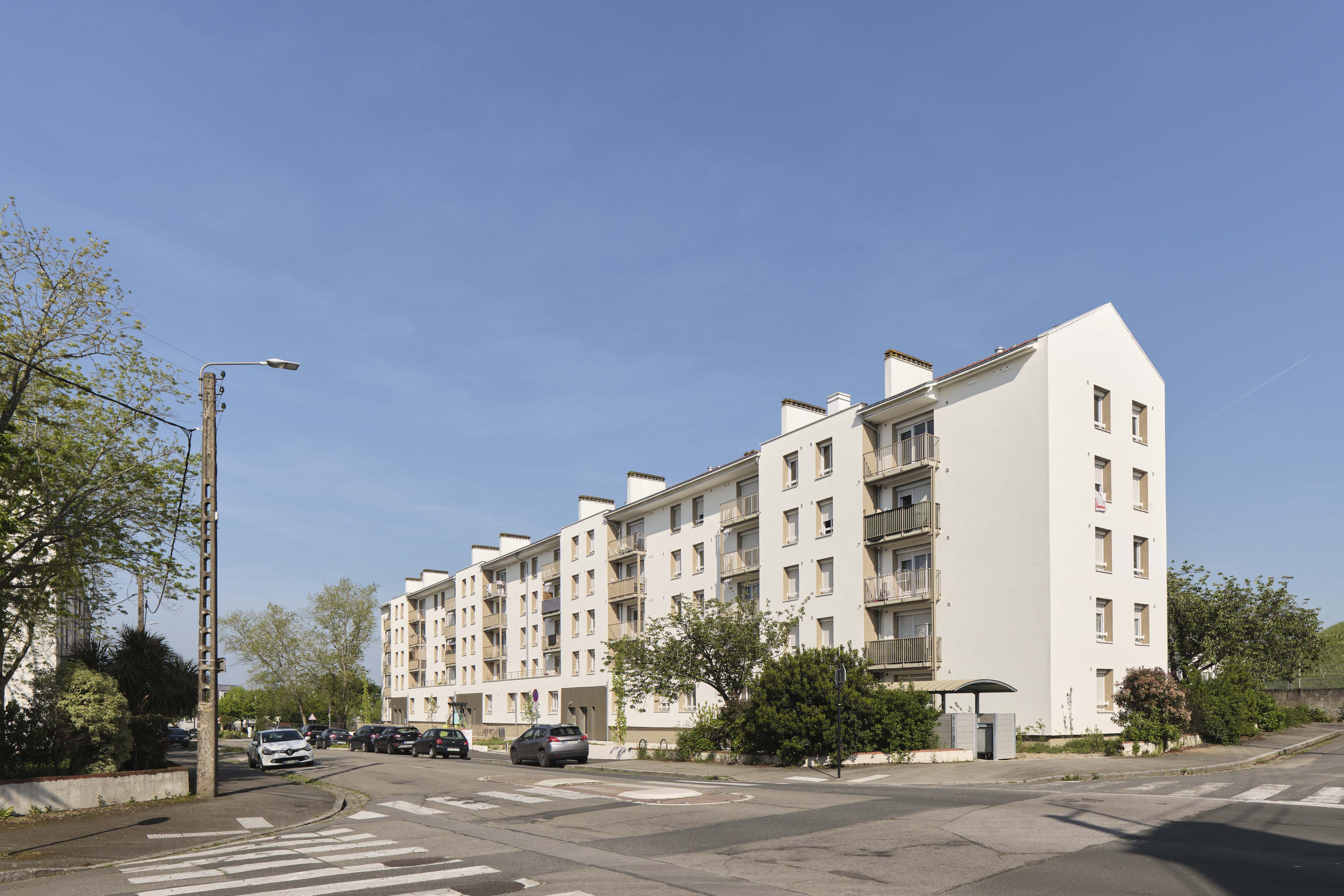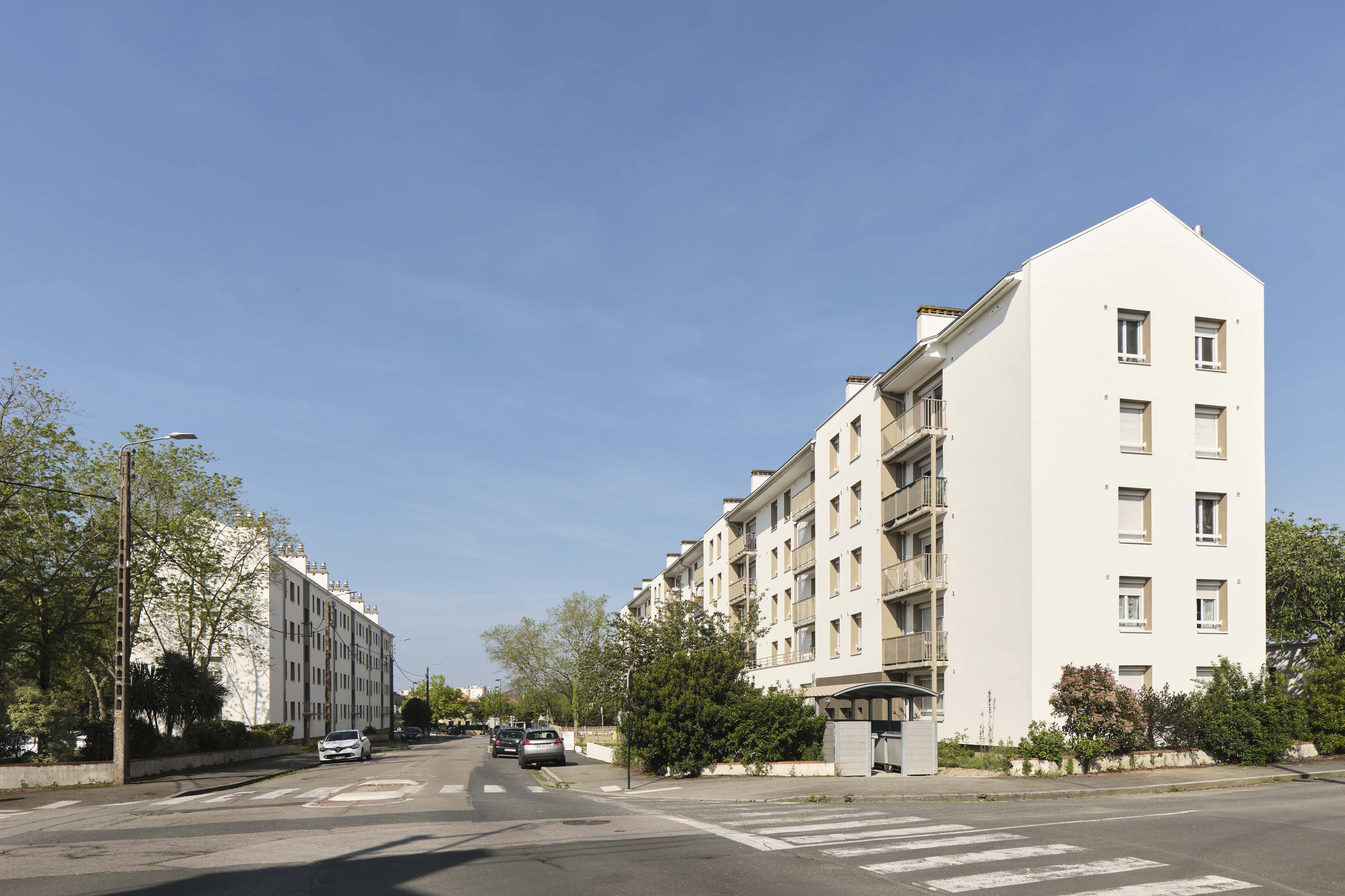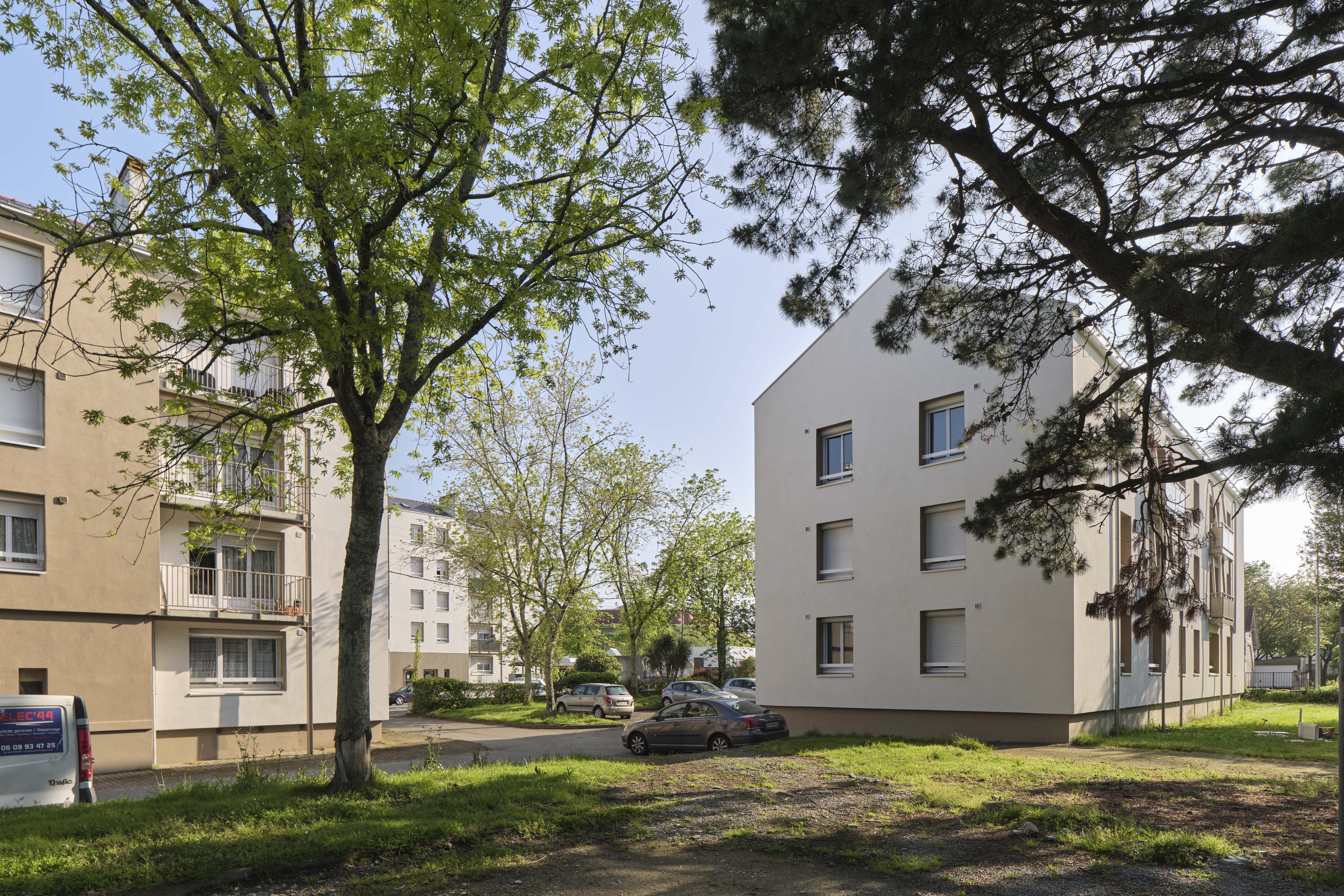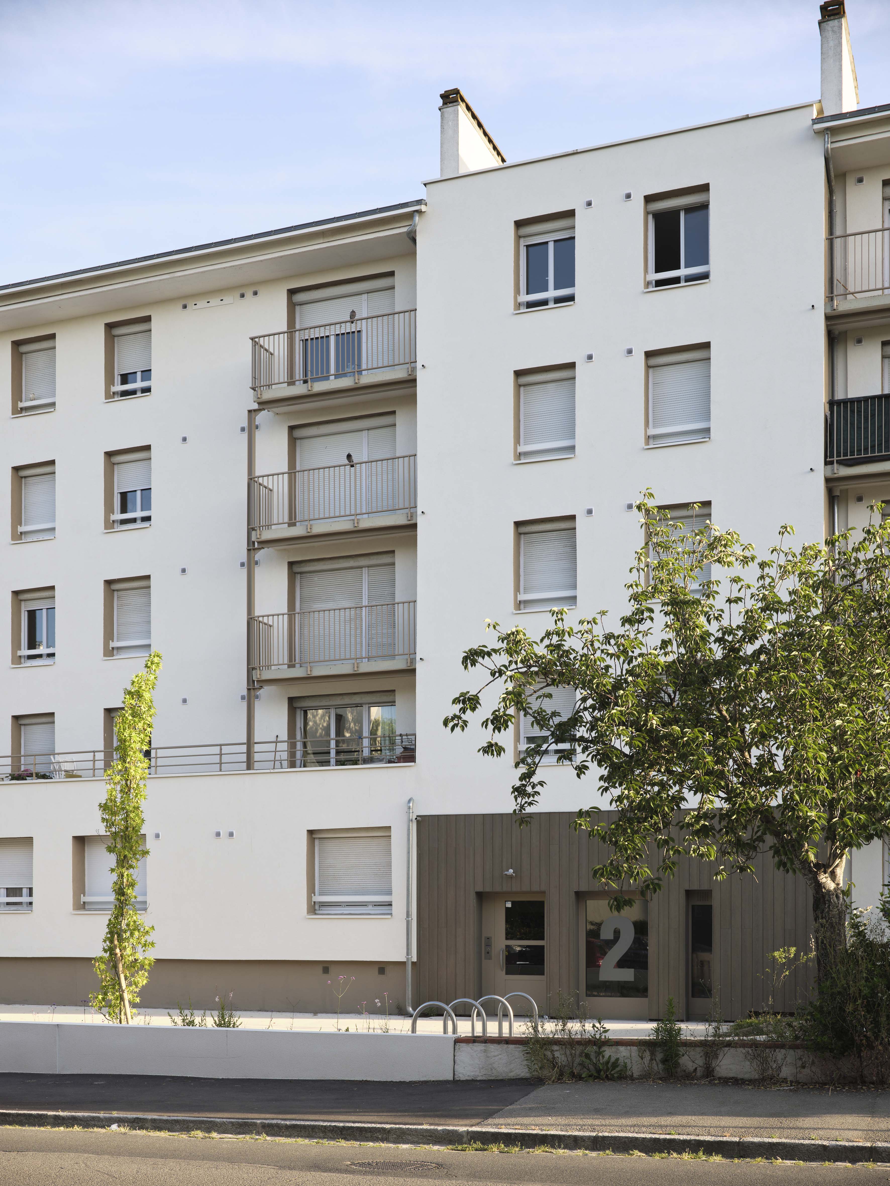 Le projet consiste en la requalification de 76 logements collectifs et 5 commerces sont également transformés en logements. La rénovation des façades a pour but de redonner de l’attrait à ces 76 logements dans ce quartier qualifié de peu valorisant pour les locataires. Sur le plus grand bâtiment, les frontons sont déposés et un bardage bois vient marquer l’entrée de chaque cage. Sur le bâtiment d’en face, c’est du zinc brun qui vient valoriser chaque entrée d’immeuble. Sur les deux petits immeubles, les pignons sont recouverts de bardage bois également. Une résidentialisation accompagne également la valorisation des façades : un parvis piéton remplace le parking le long des commerces en façade sud du grand immeuble. Le parking passe au nord. Des espaces pour enfants, pour ados et pour des moments familiaux sont dispersés sur le site.