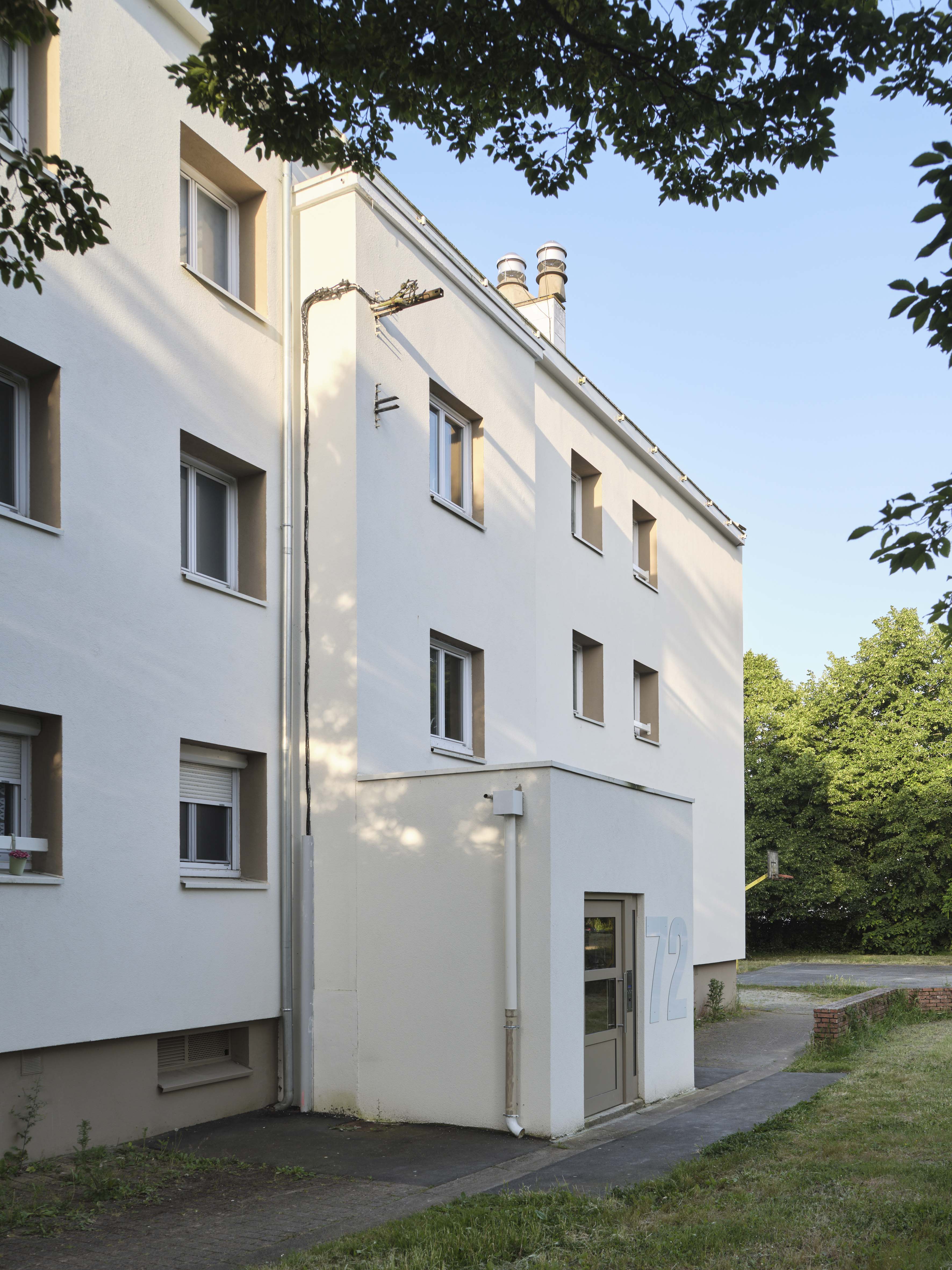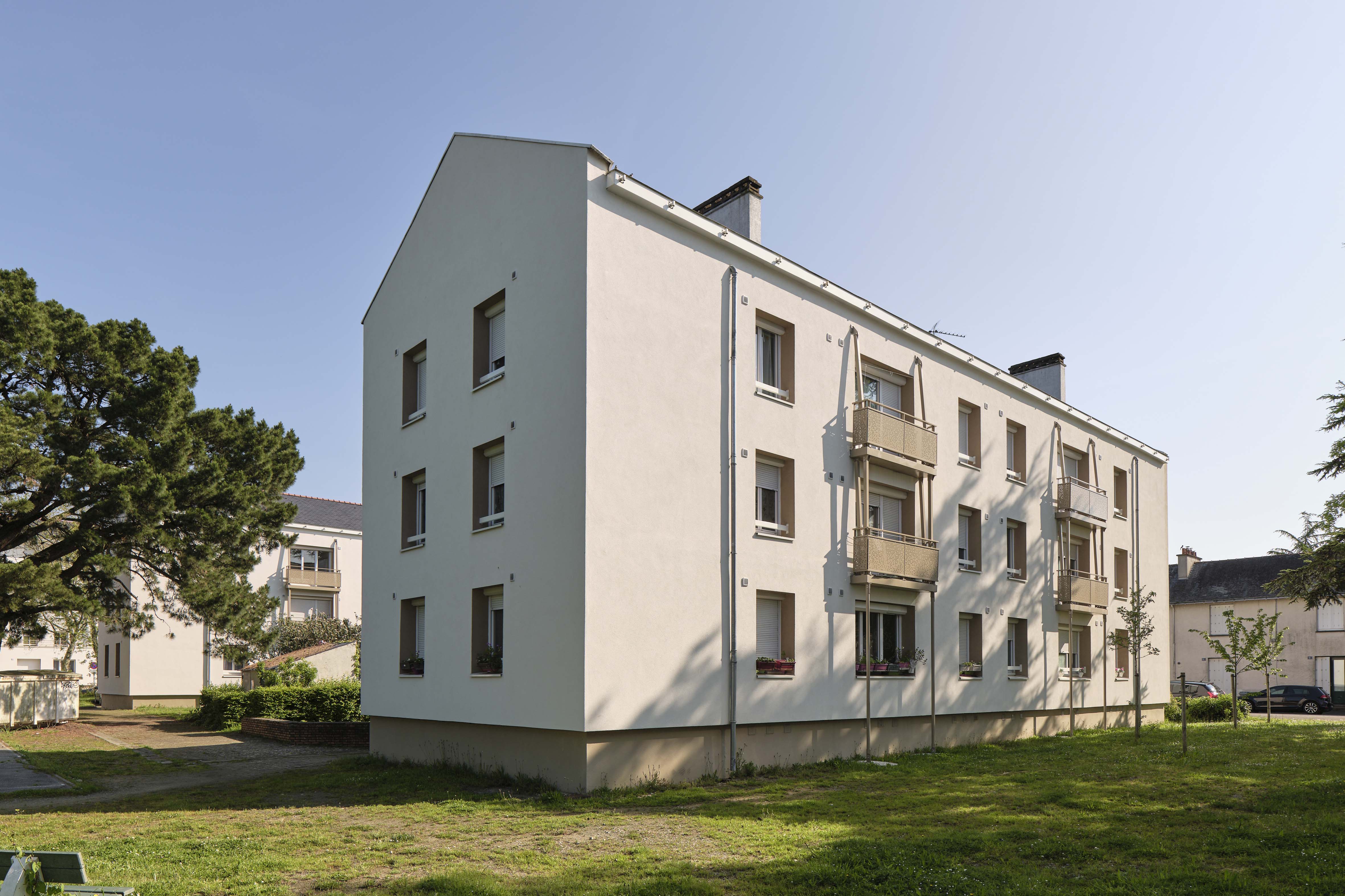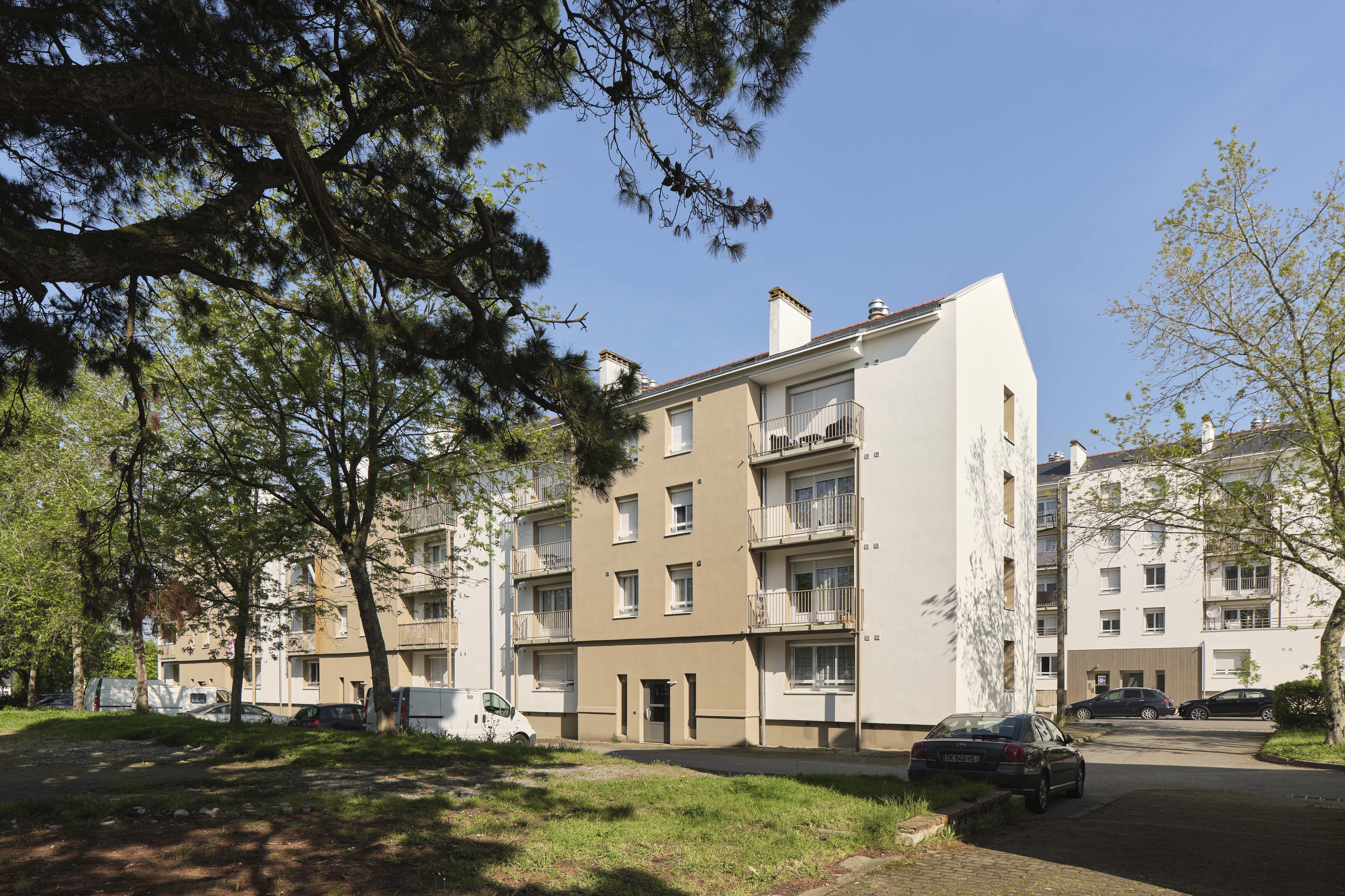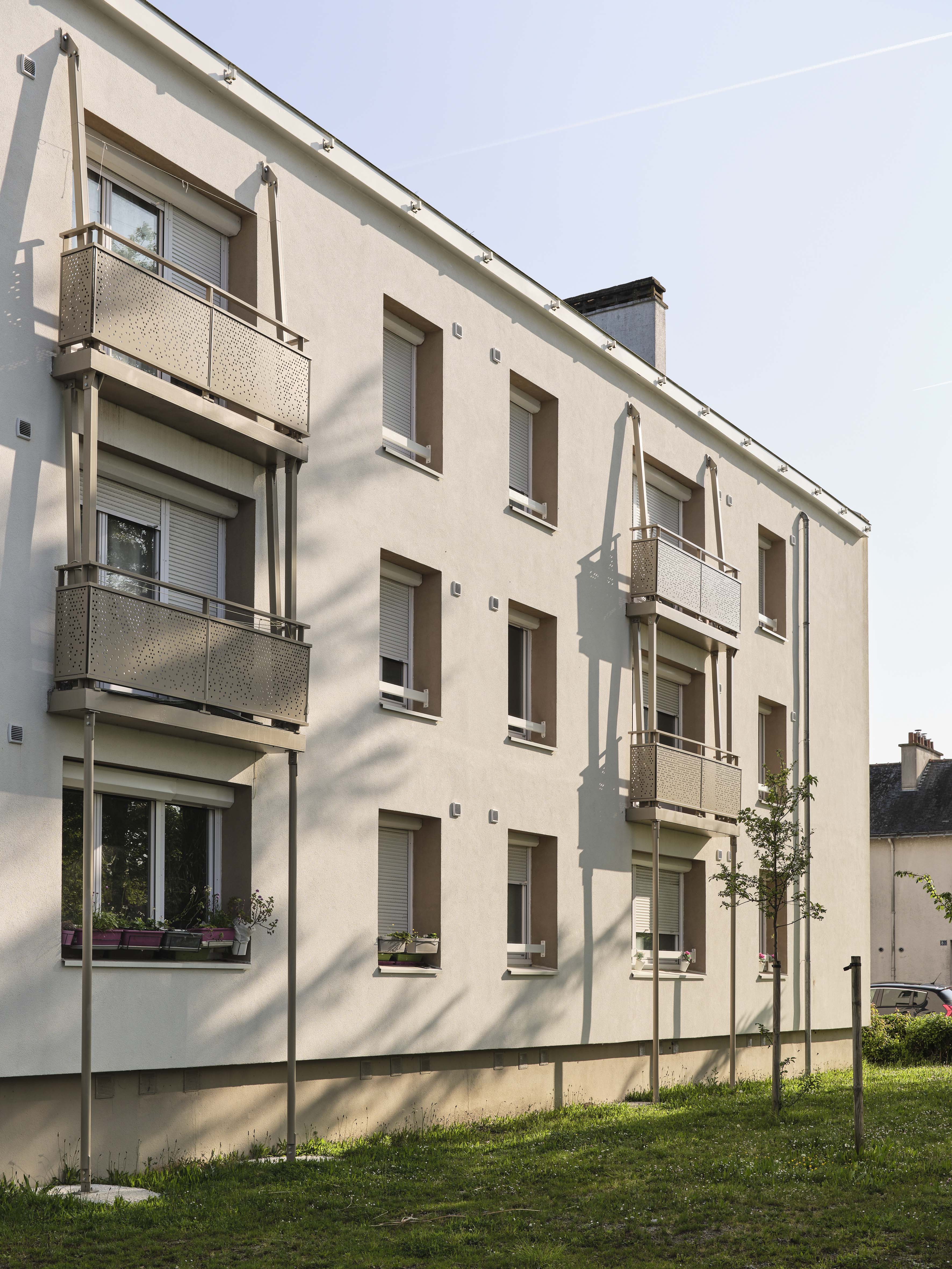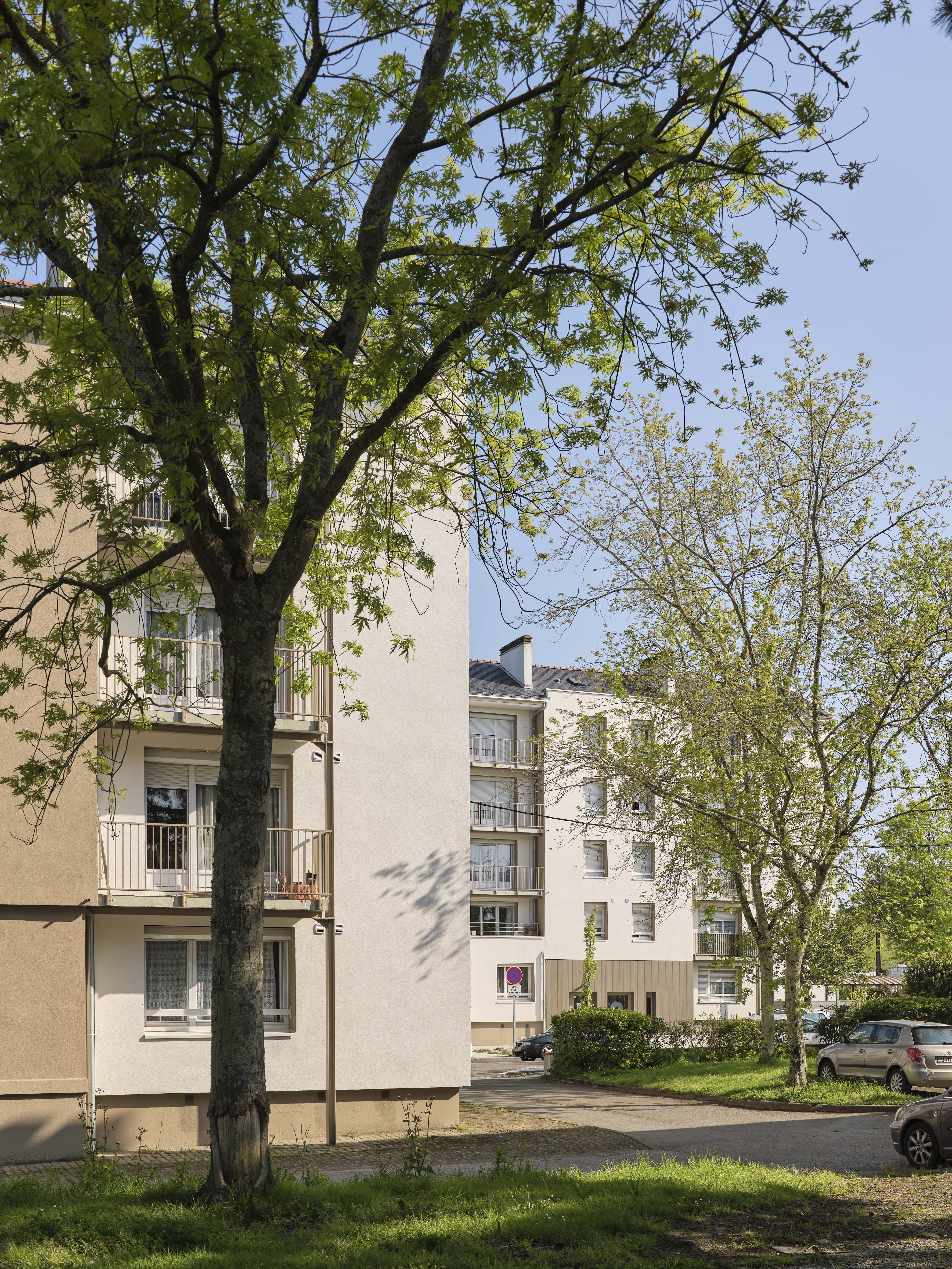 Le projet consiste en la requalification de 76 logements collectifs et 5 commerces sont également transformés en logements. La rénovation des façades a pour but de redonner de l’attrait à ces 76 logements dans ce quartier qualifié de peu valorisant pour les locataires. Sur le plus grand bâtiment, les frontons sont déposés et un bardage bois vient marquer l’entrée de chaque cage. Sur le bâtiment d’en face, c’est du zinc brun qui vient valoriser chaque entrée d’immeuble. Sur les deux petits immeubles, les pignons sont recouverts de bardage bois également. Une résidentialisation accompagne également la valorisation des façades : un parvis piéton remplace le parking le long des commerces en façade sud du grand immeuble. Le parking passe au nord. Des espaces pour enfants, pour ados et pour des moments familiaux sont dispersés sur le site.