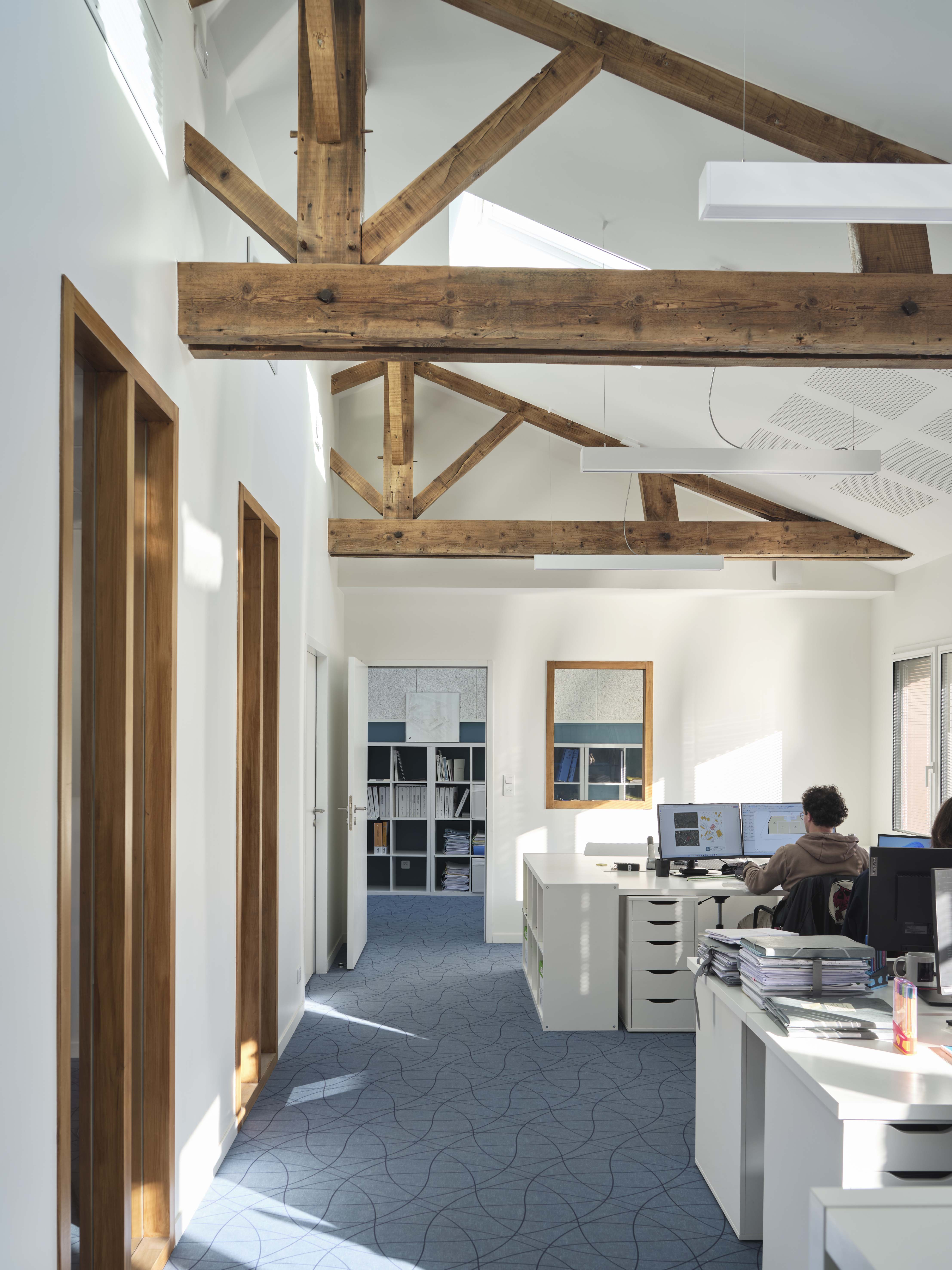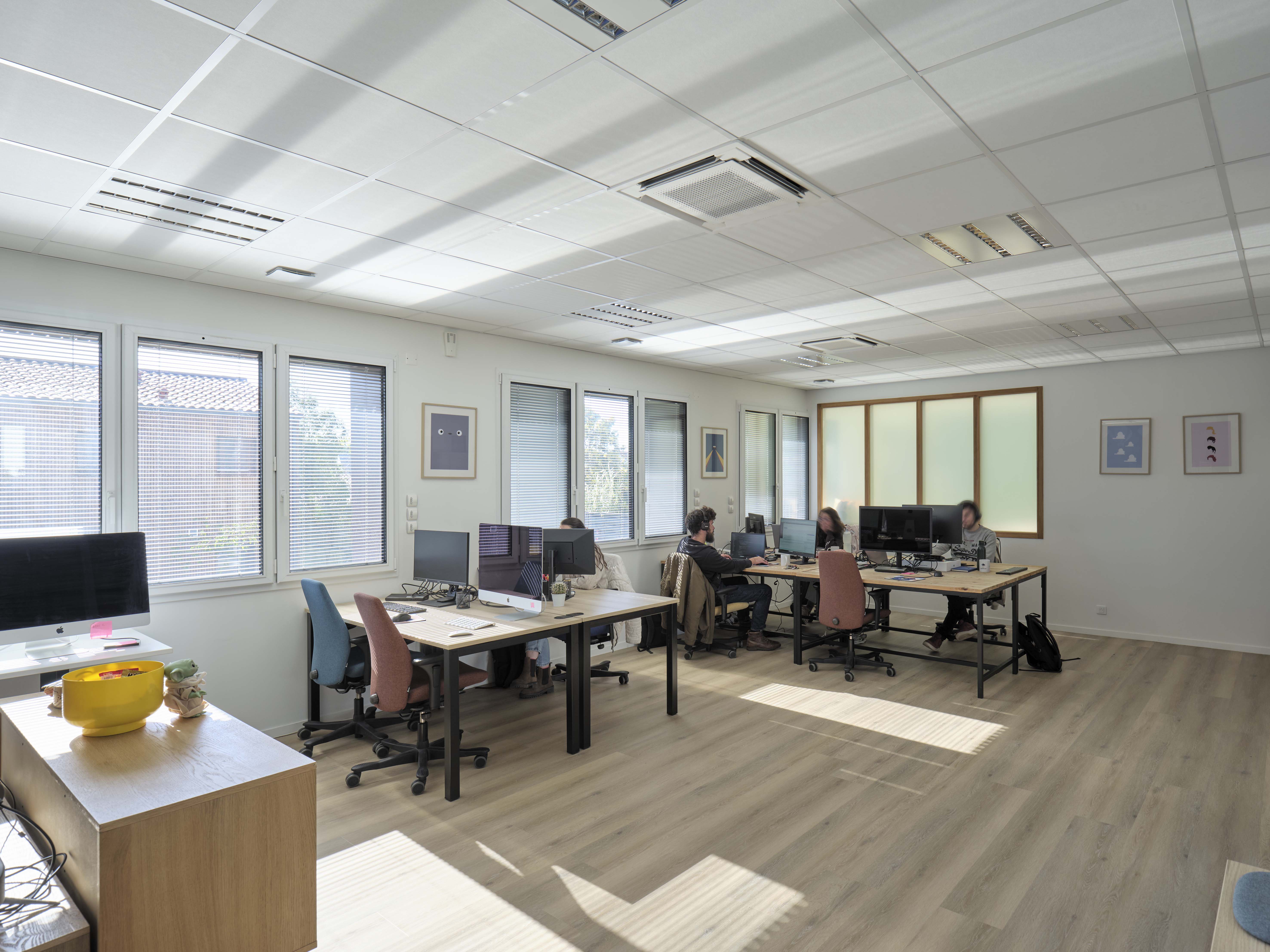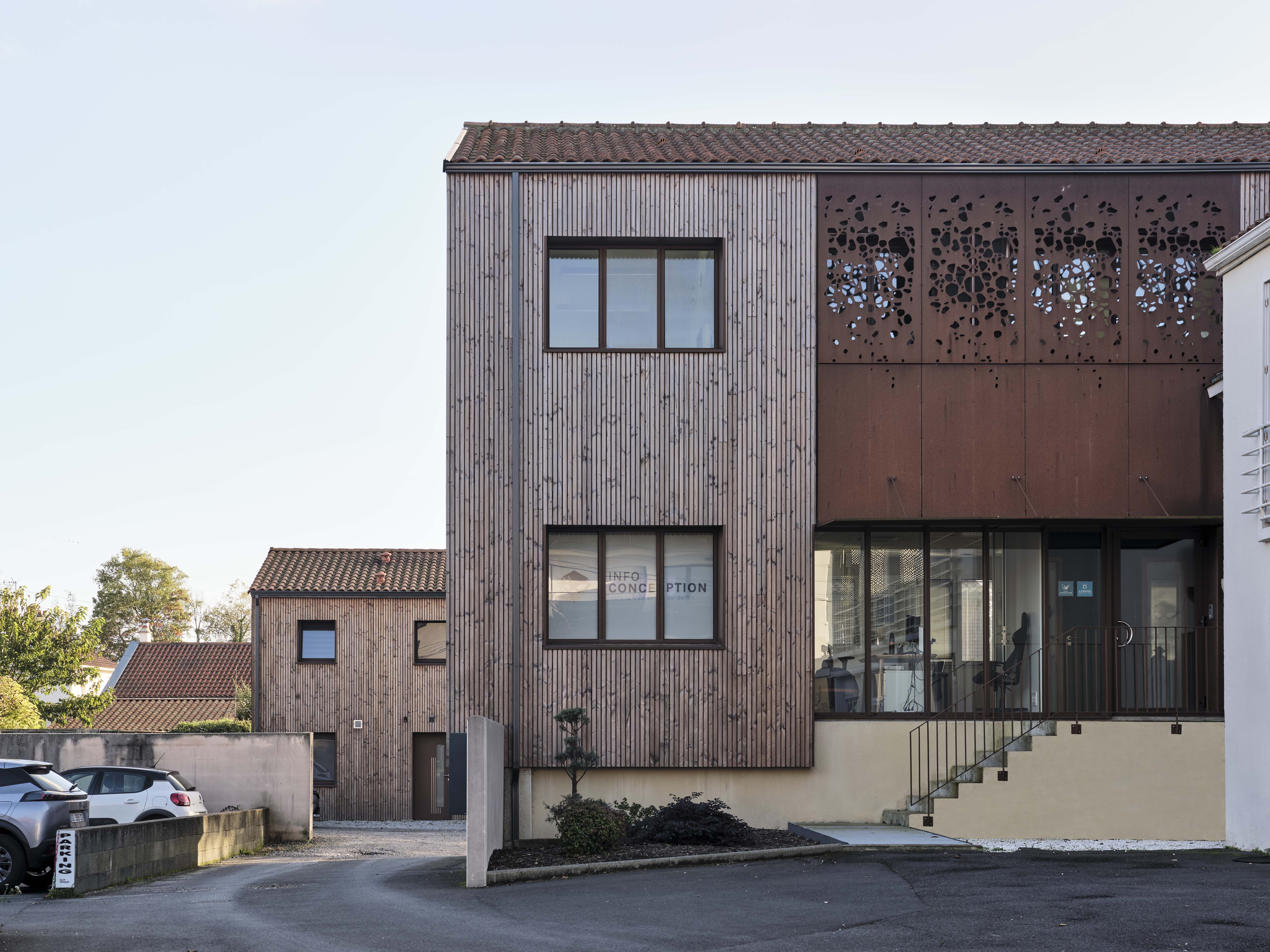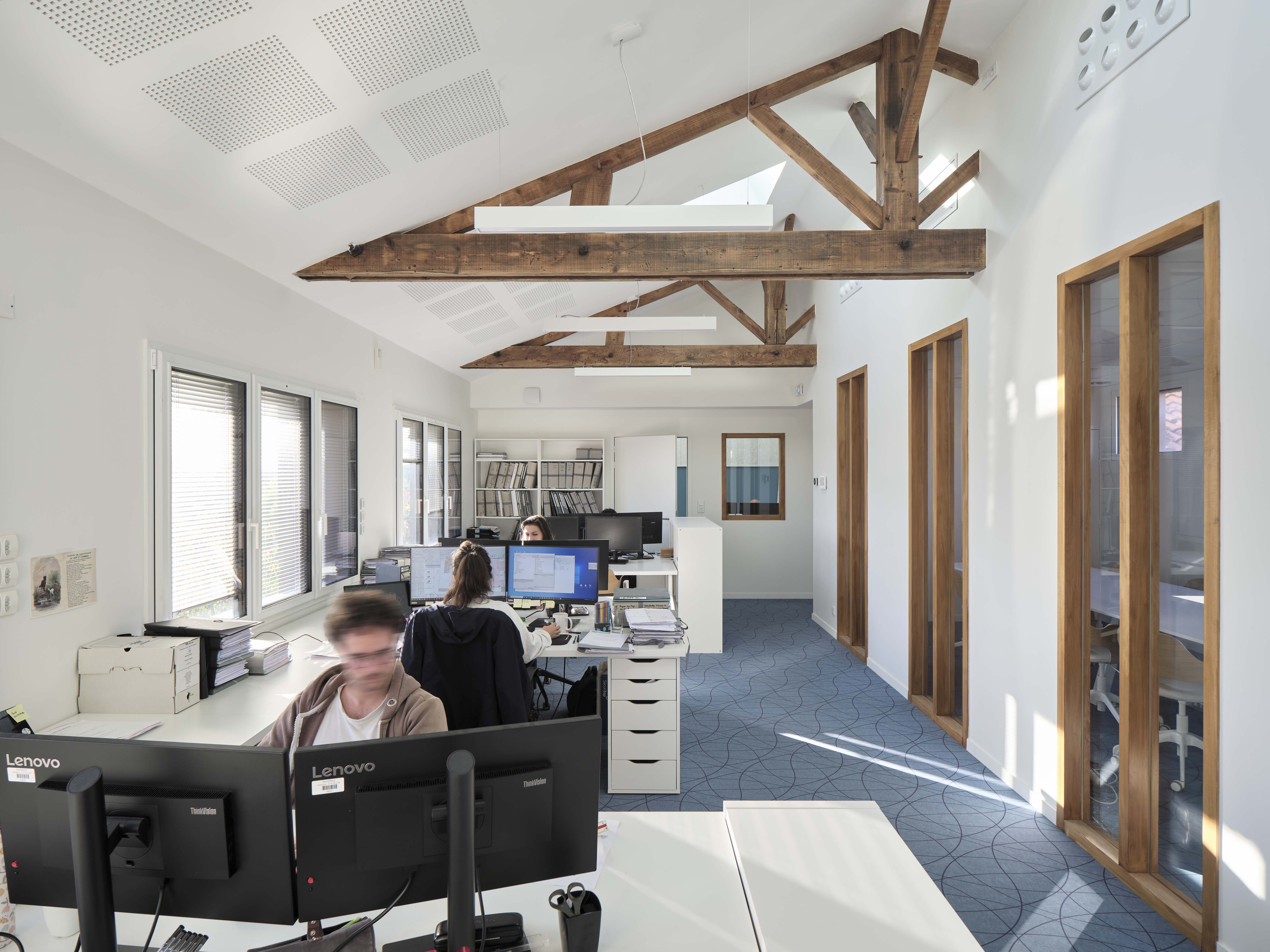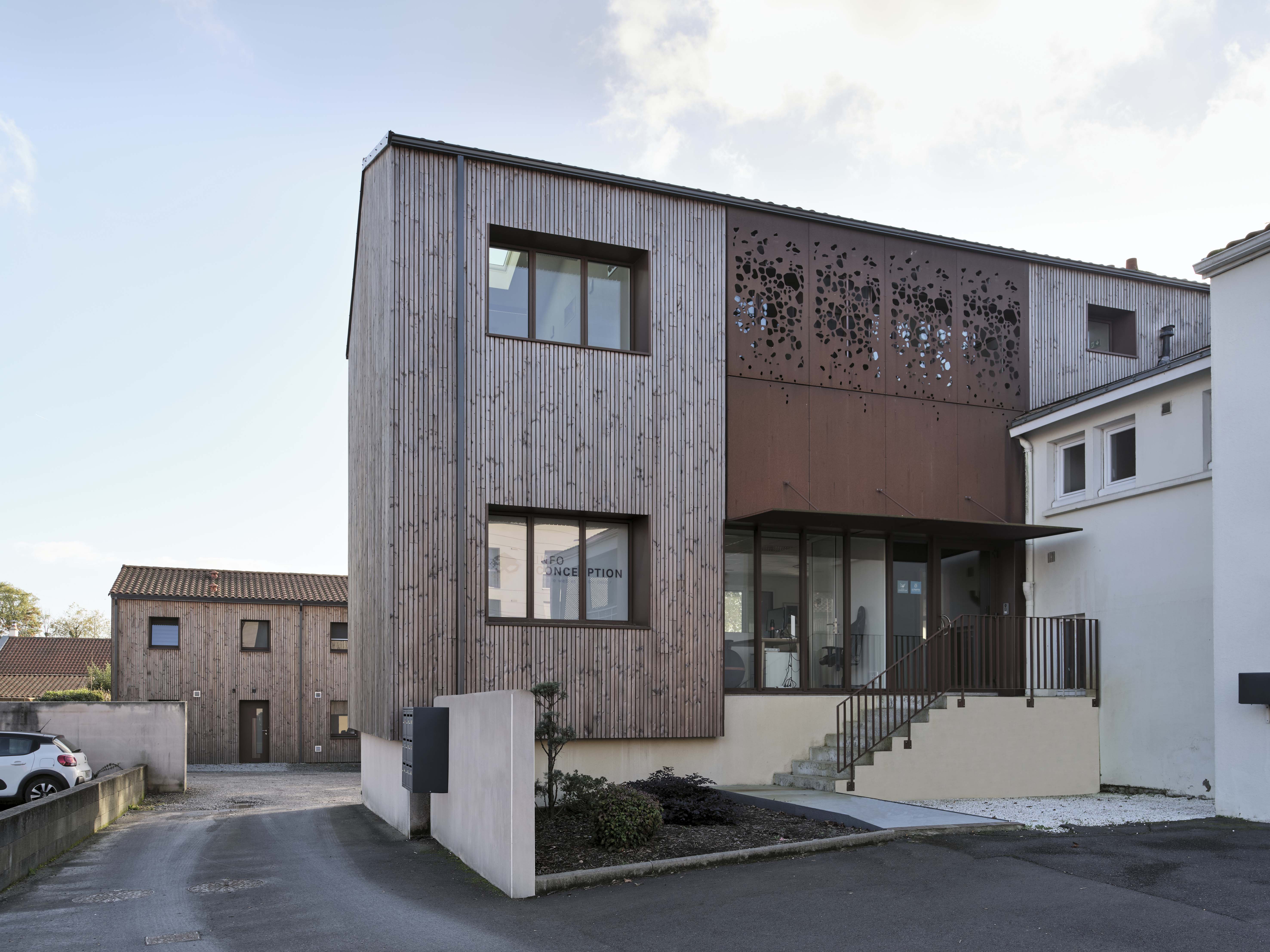 L’ancien Hôtel de l’Anjou de Vertou a été transformé en maison dans les années 80/90 avant de devenir un immeuble de bureaux. Réisolé par l’extérieur et complètement réaménagé à l’intérieur, il offre 2 plateaux de bureaux au RDC et R+1 et une aire de stationnement en rez-de-cour. Les menuiseries triple vitrage équipées de stores intérieurs, couplées à une ventilation double-flux permettent un confort optimal été comme hiver.