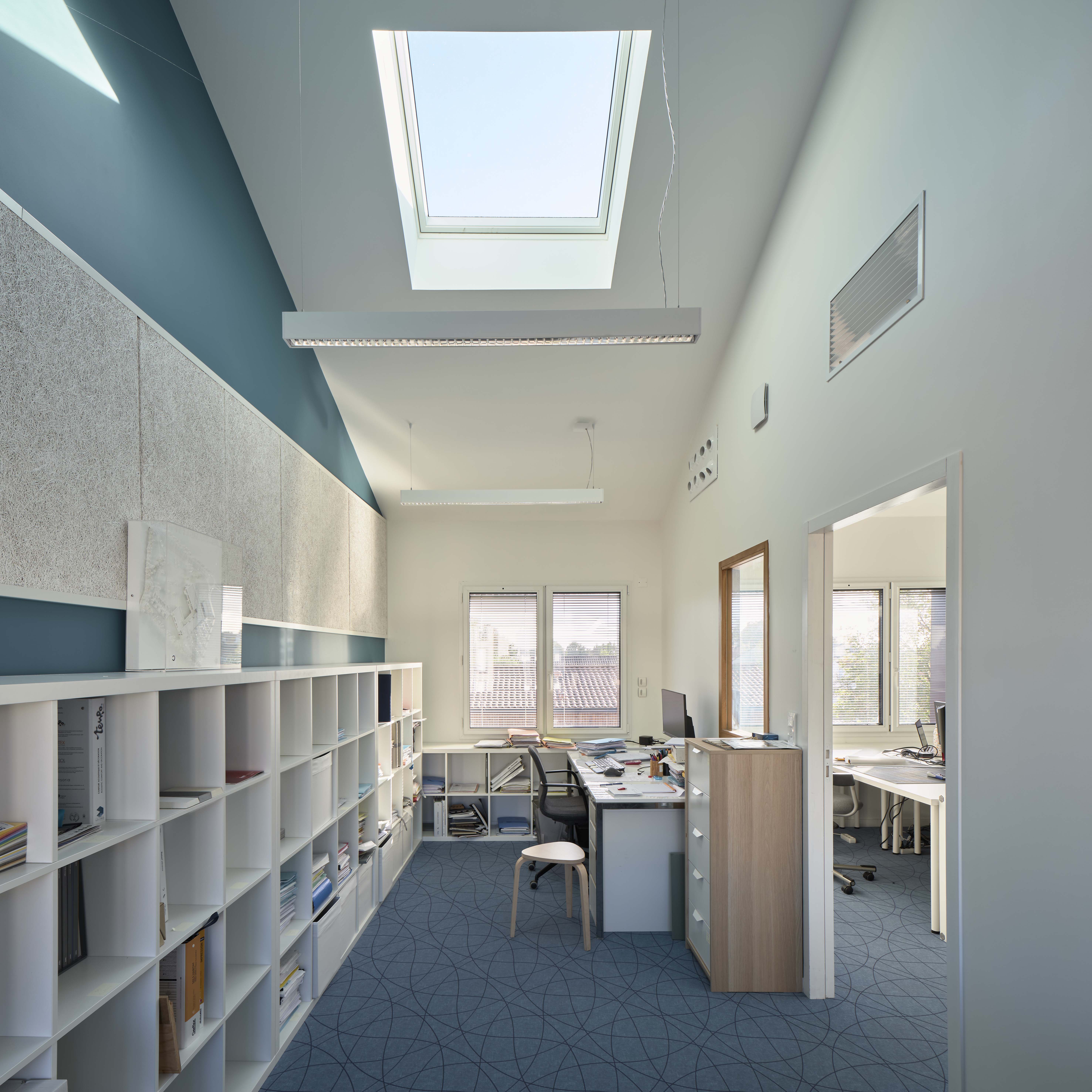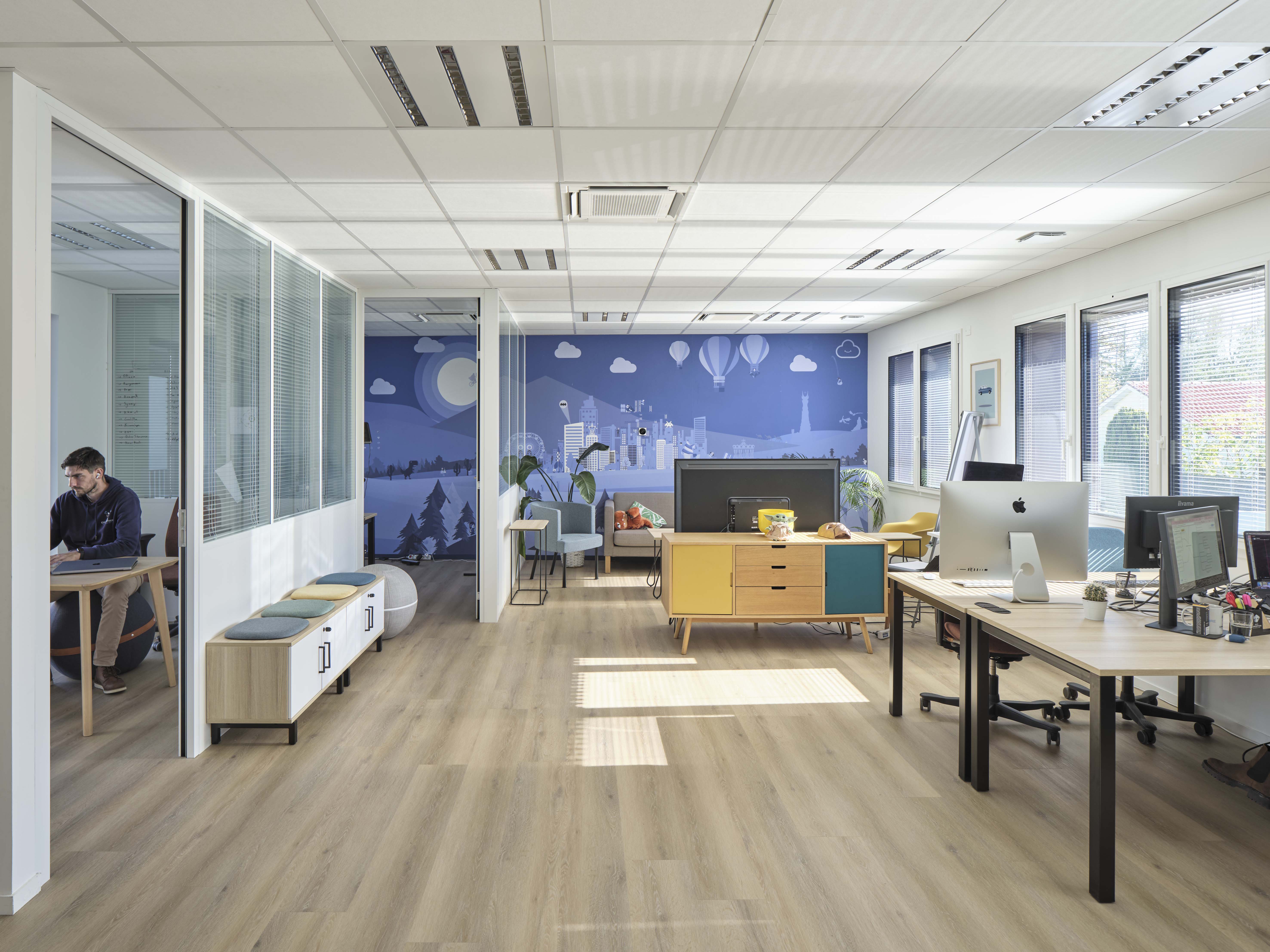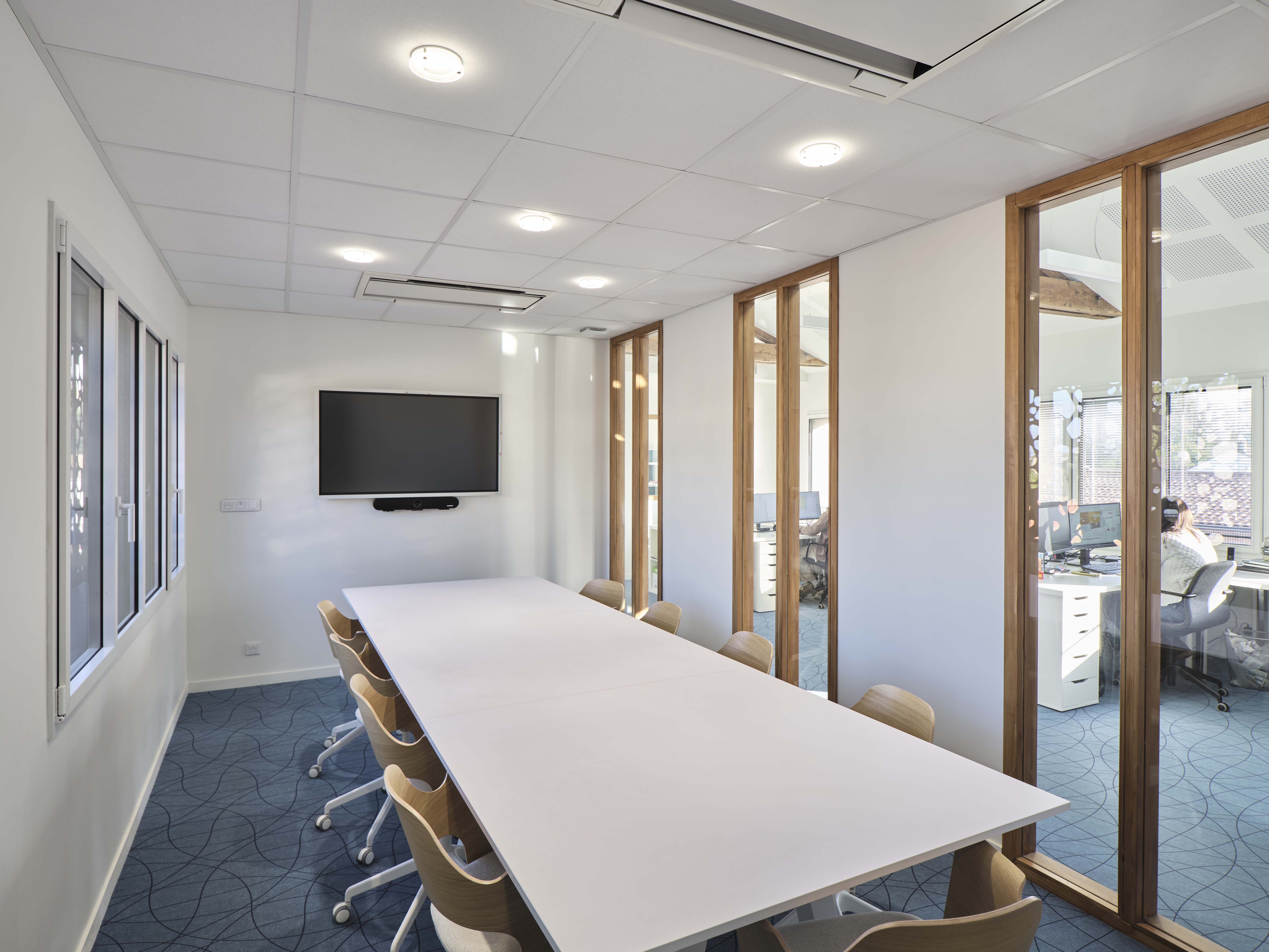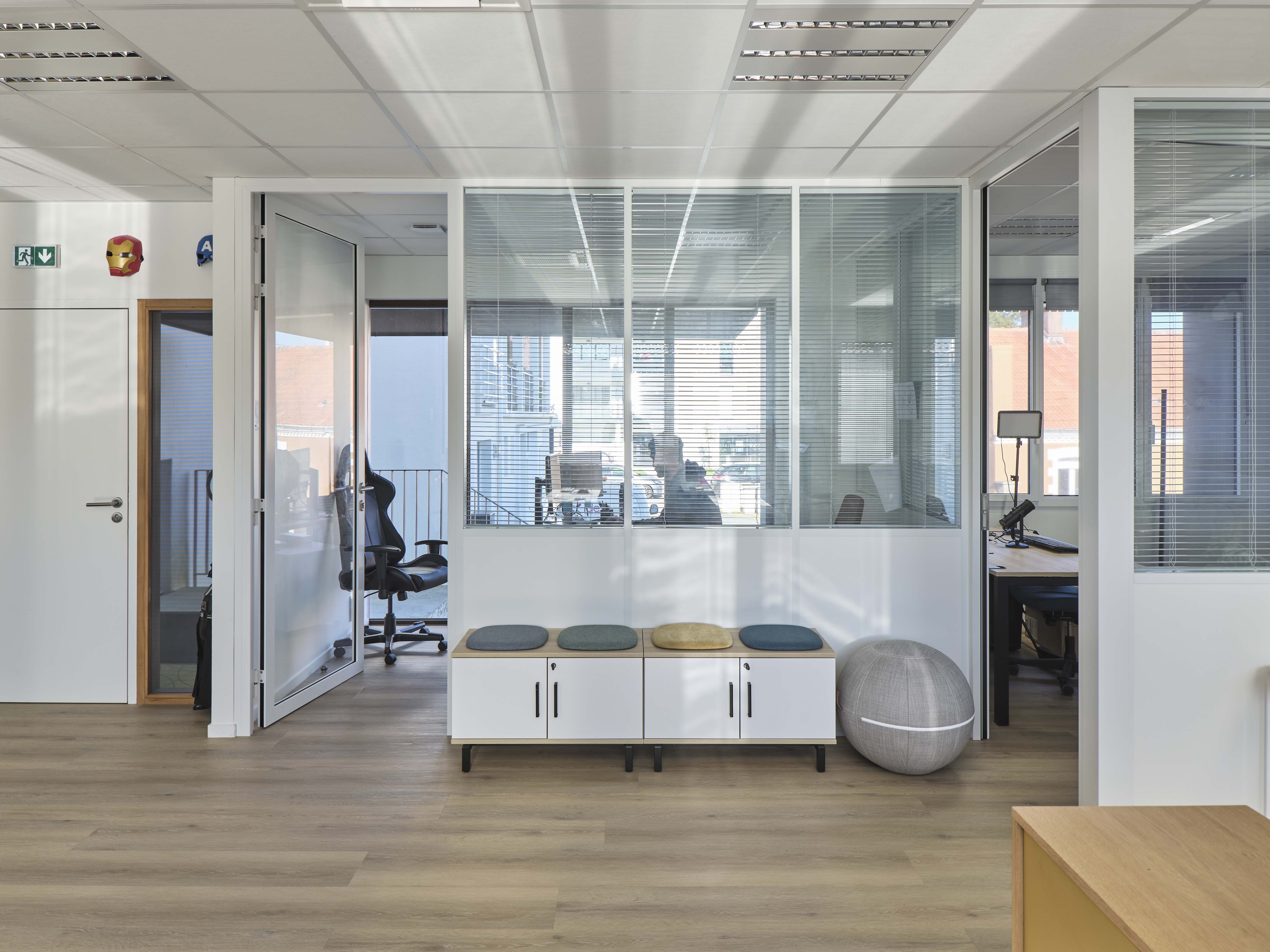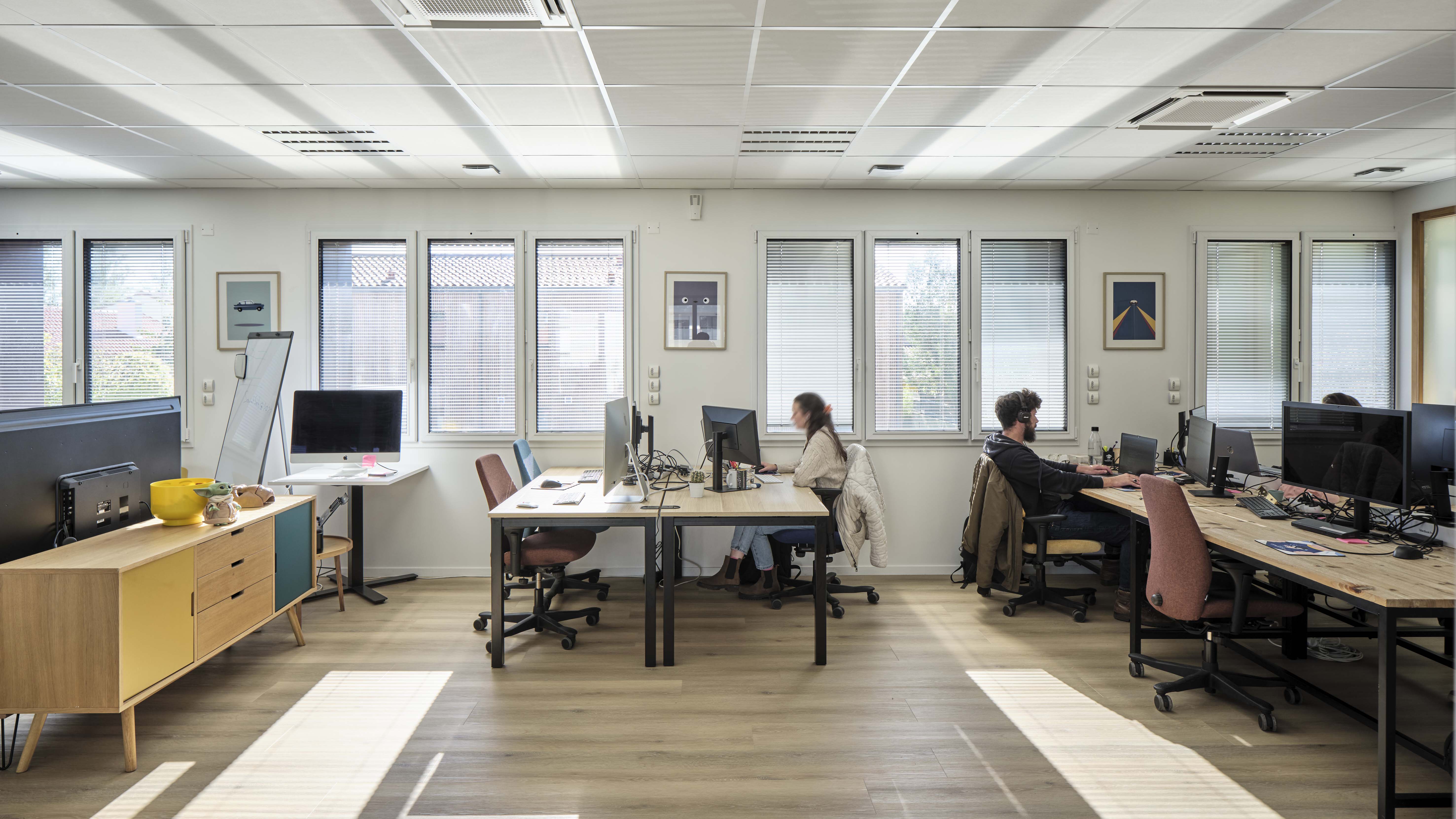 L’ancien Hôtel de l’Anjou de Vertou a été transformé en maison dans les années 80/90 avant de devenir un immeuble de bureaux. Réisolé par l’extérieur et complètement réaménagé à l’intérieur, il offre 2 plateaux de bureaux au RDC et R+1 et une aire de stationnement en rez-de-cour. Les menuiseries triple vitrage équipées de stores intérieurs, couplées à une ventilation double-flux permettent un confort optimal été comme hiver.