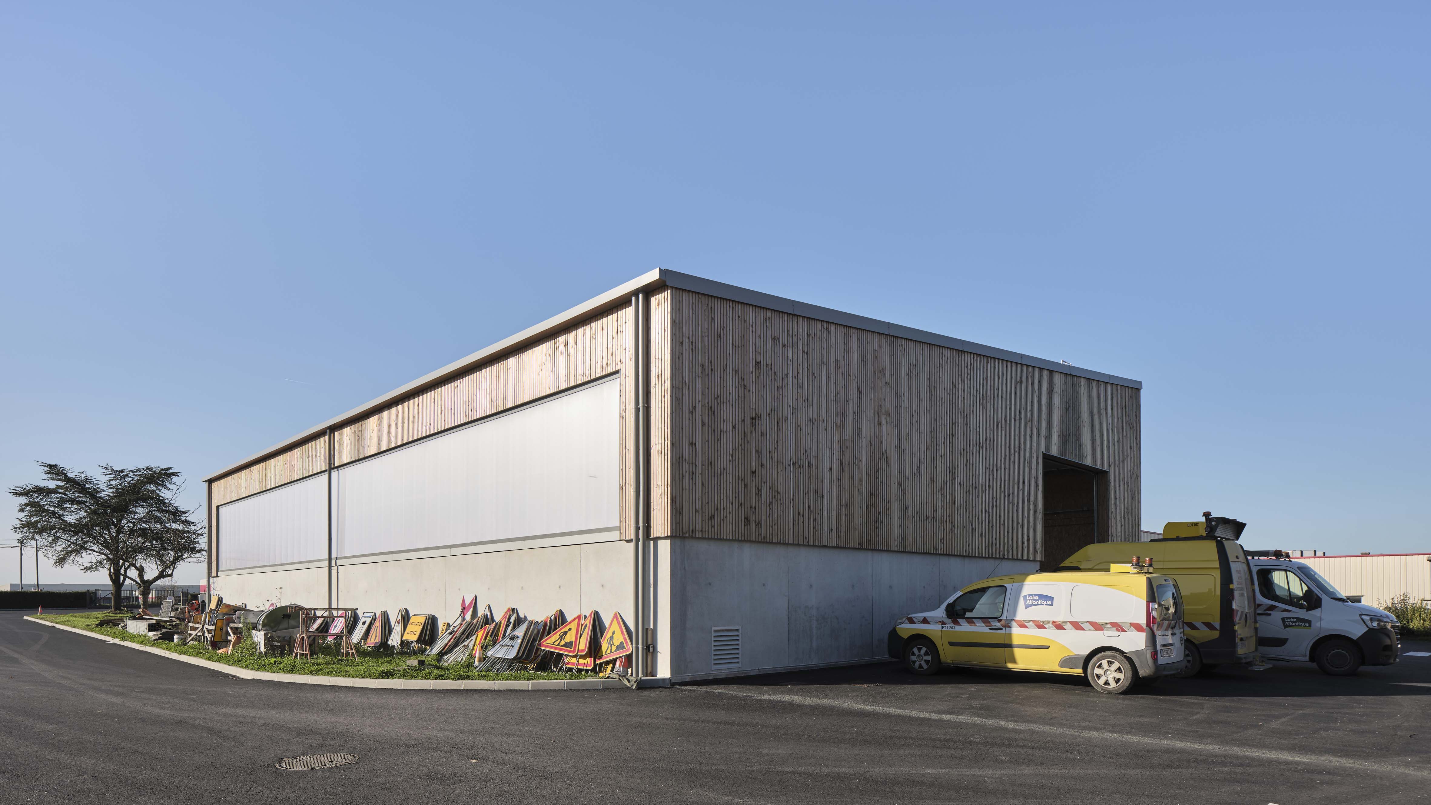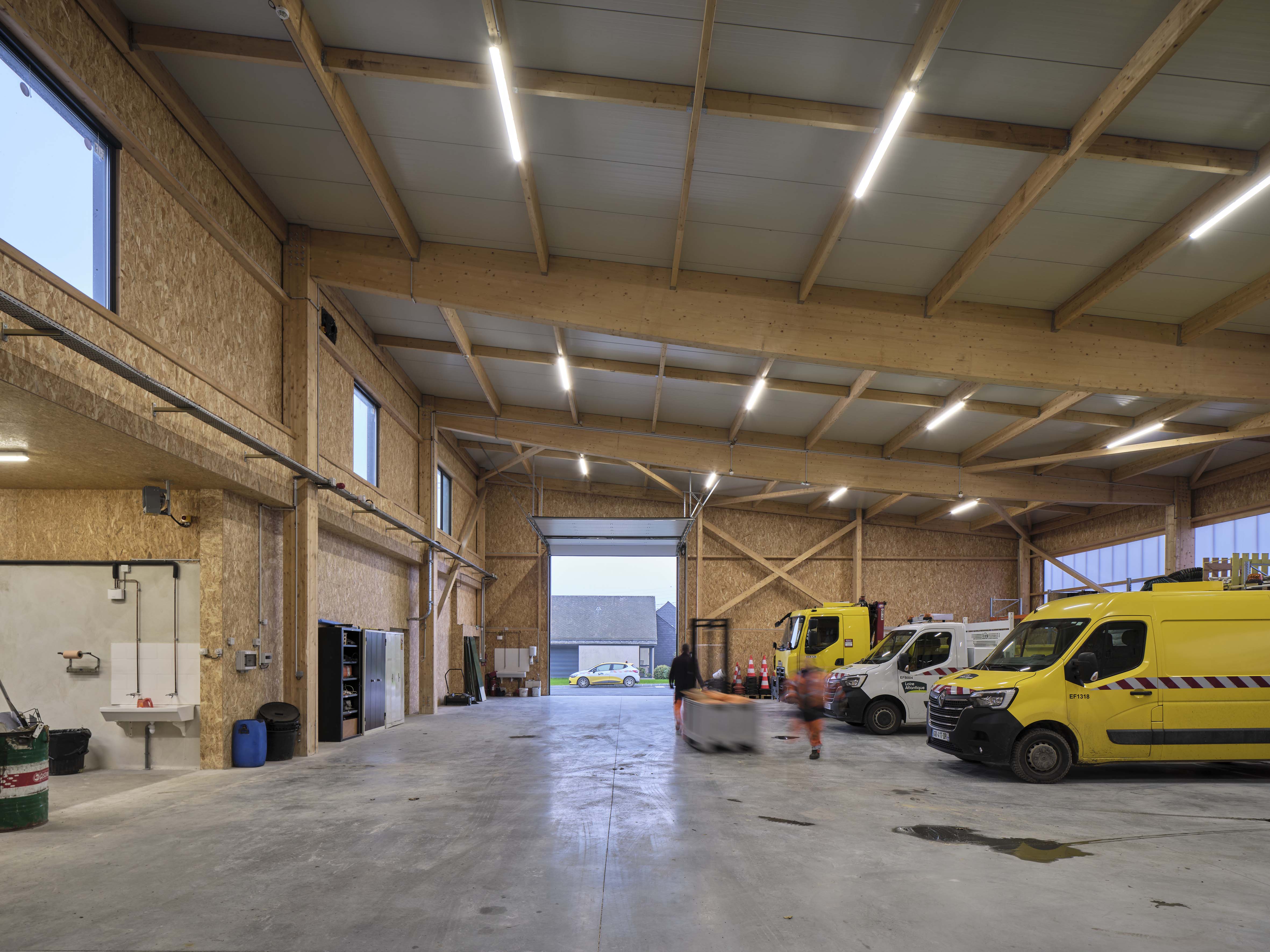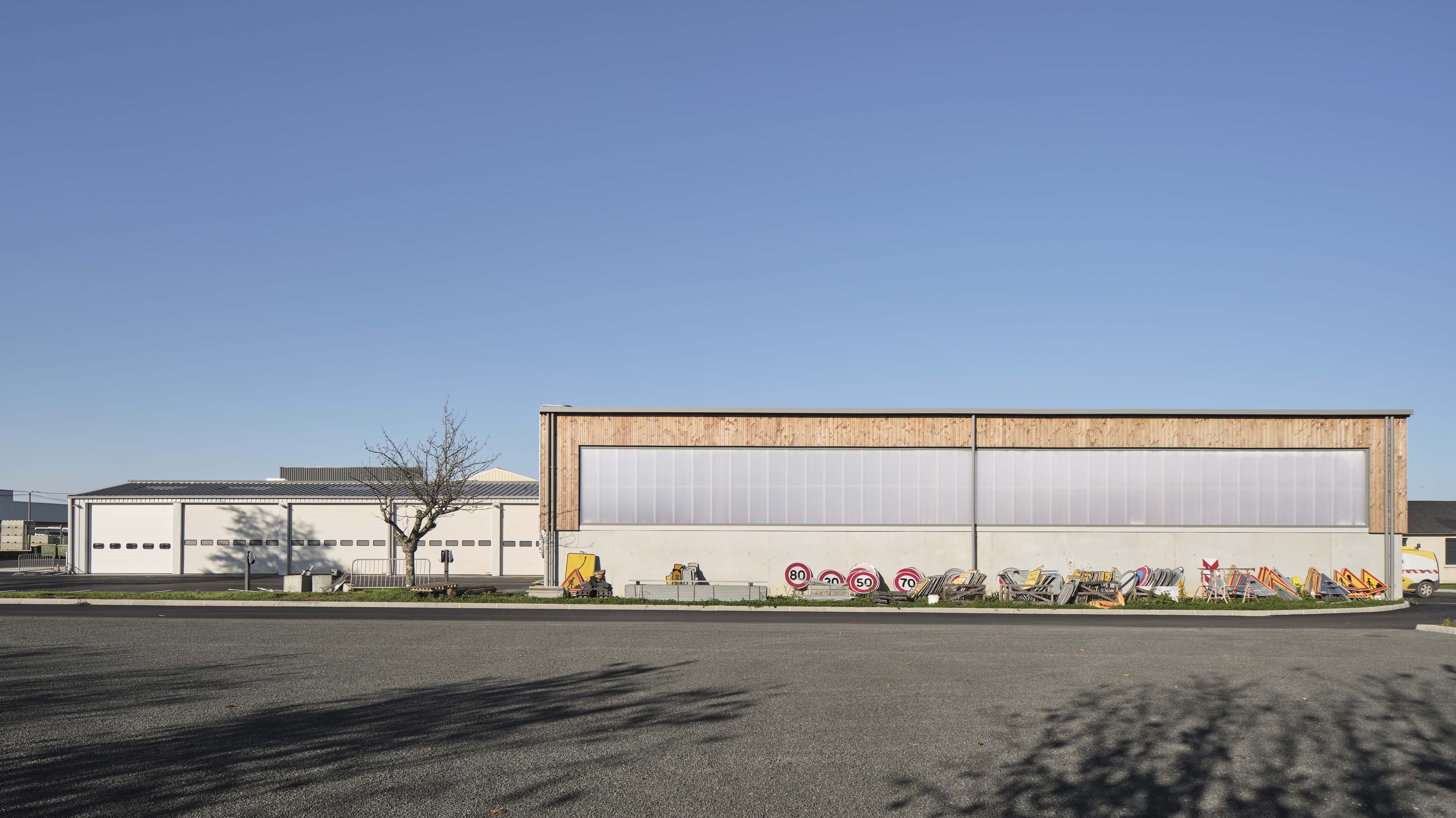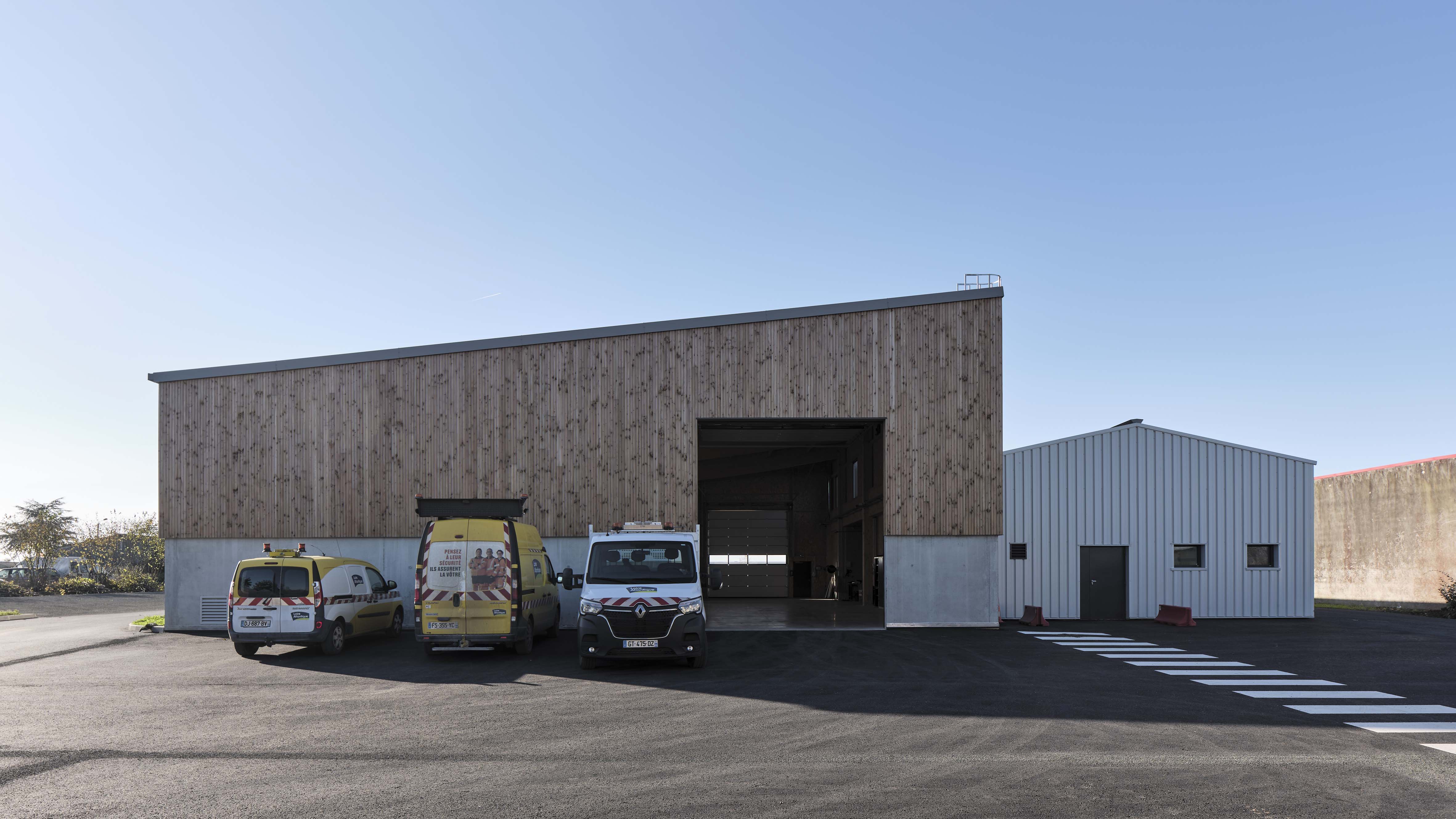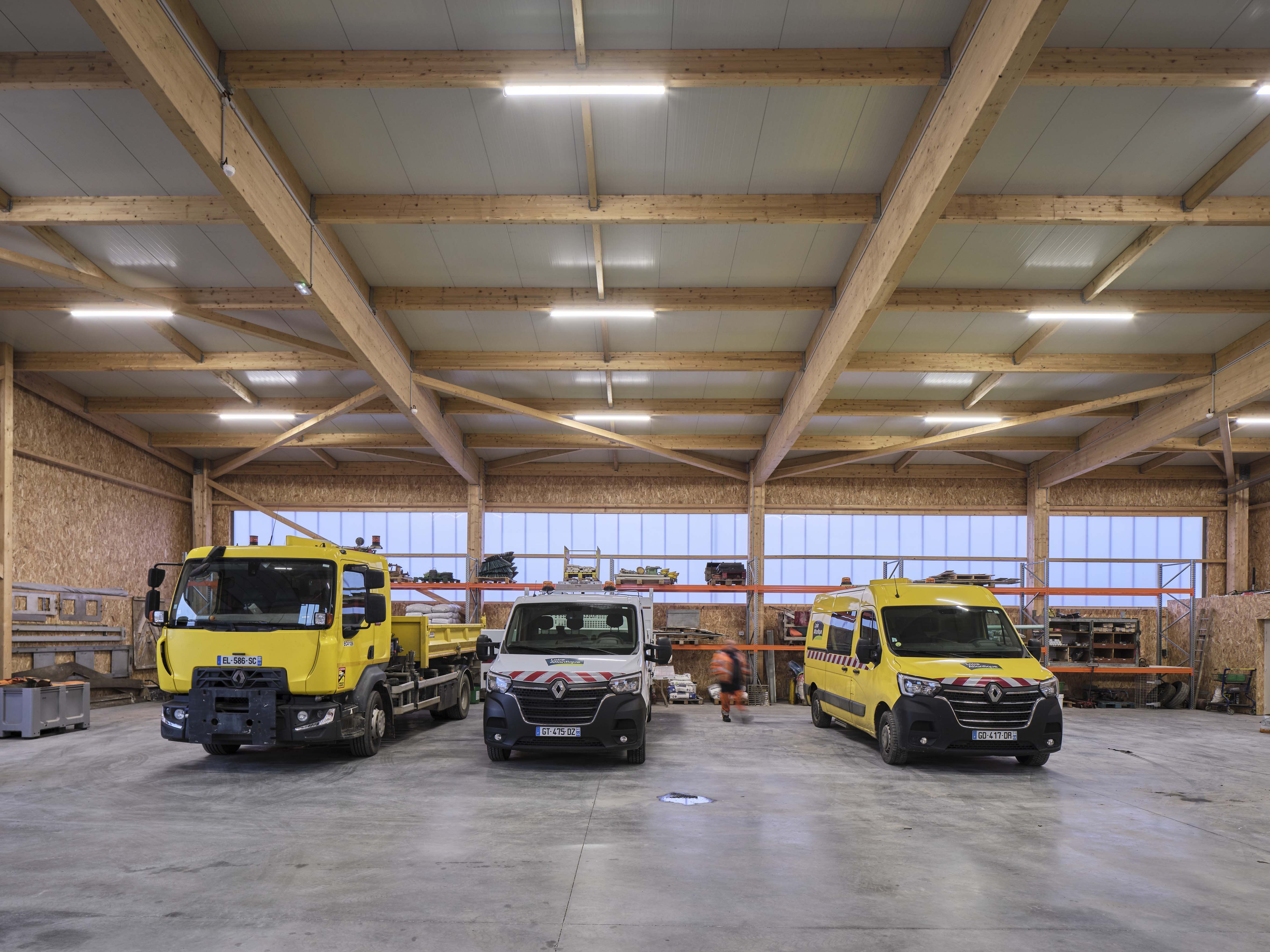 Le CIR occupe la totalité des locaux existants de la DDE réhabilités et nécessite une extension pour accueillir tous les véhicules et les équipements des services. Pour réduire les couts de l’opération, une réorganisation complète du site est réalisée en préservant les ouvrages utiles et pérennes en cohérence avec le fonctionnement des agents. La couverture amiantée est remplacée et une résine est appliquée sur les sols existants pour accueillir des véhicules et du stockage. Une boite isolée et chauffée en bois est créée sous cette halle pour les ateliers. Une extension traversante accolée à l’existant complète les besoins. Isolée et éclairée naturellement, elle facilite le travail des agents. Bardée de bois sur un soubassement en béton, la toiture est couverte de panneaux photovoltaïques, une cuve EP étant implantée sur le site.