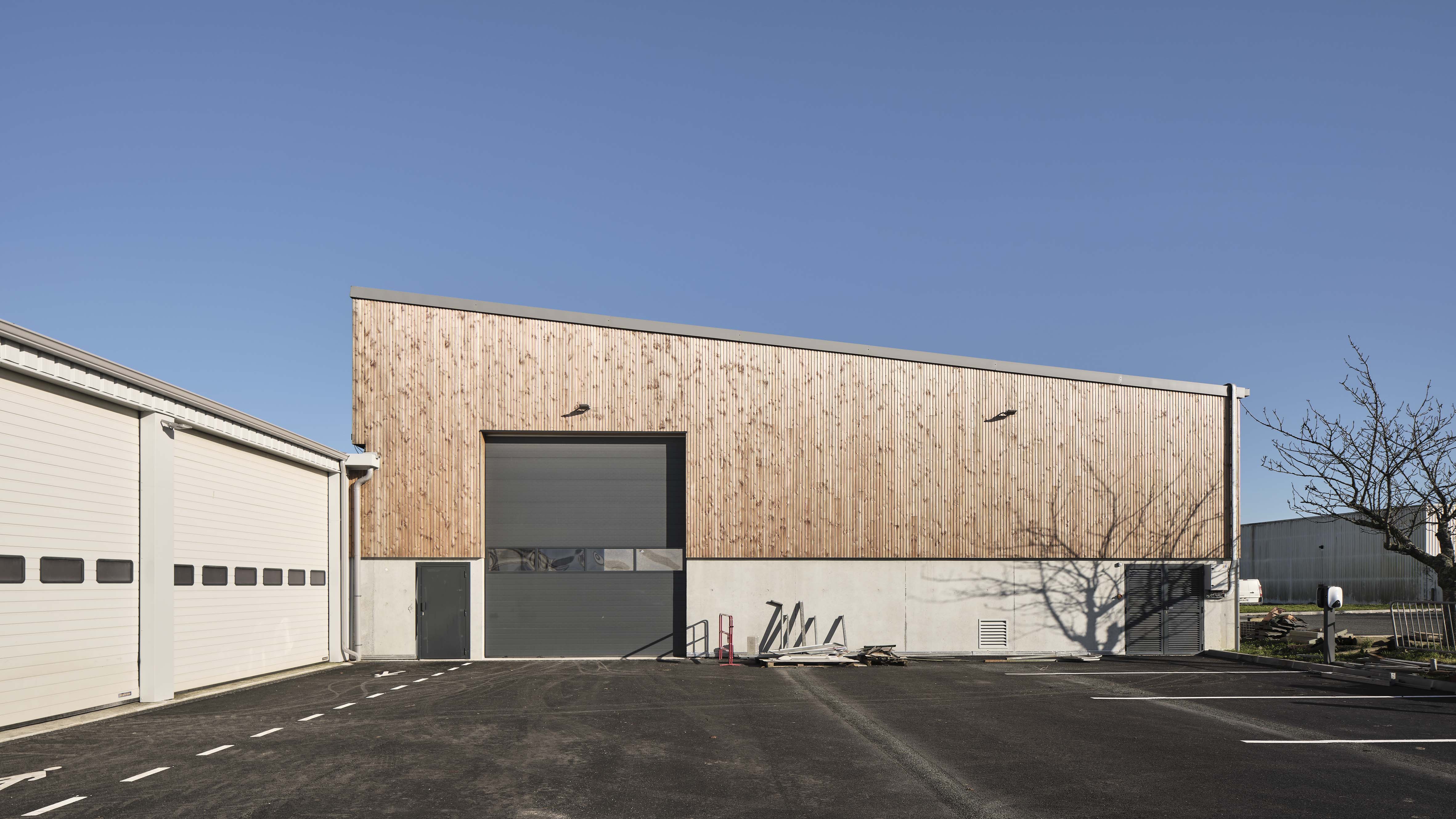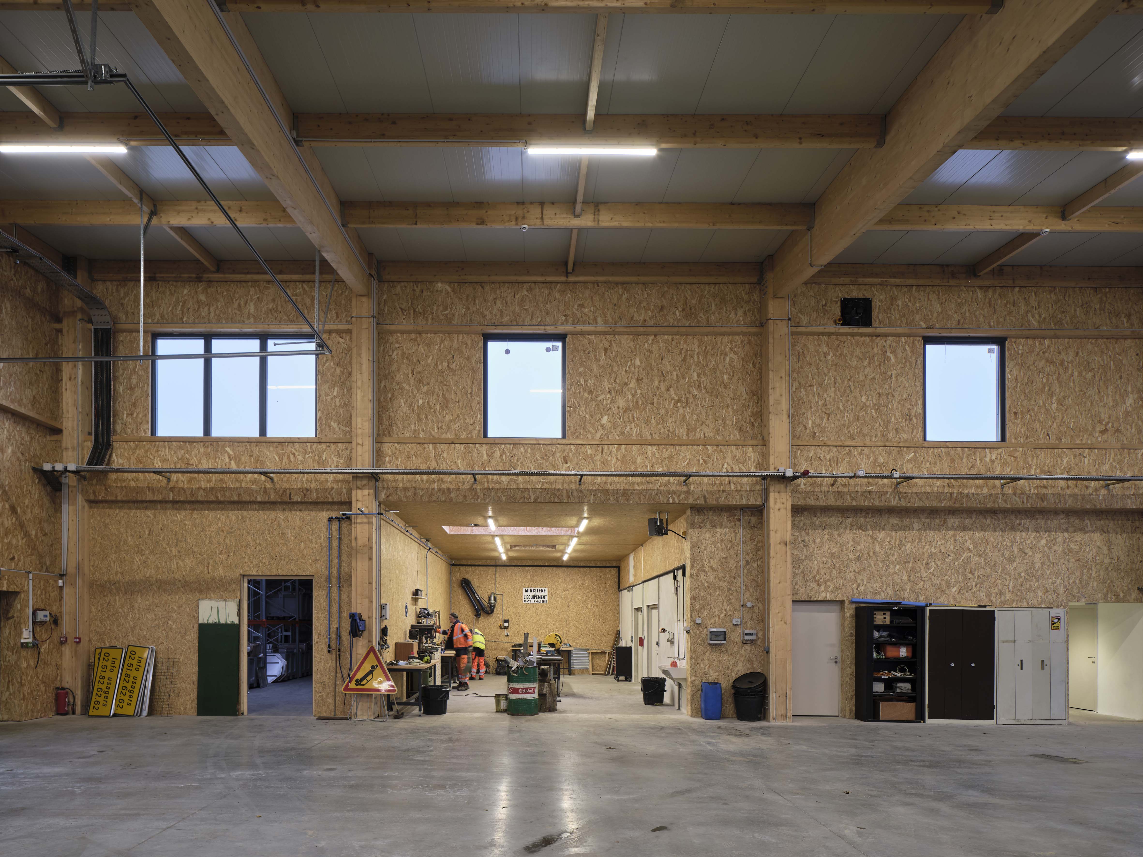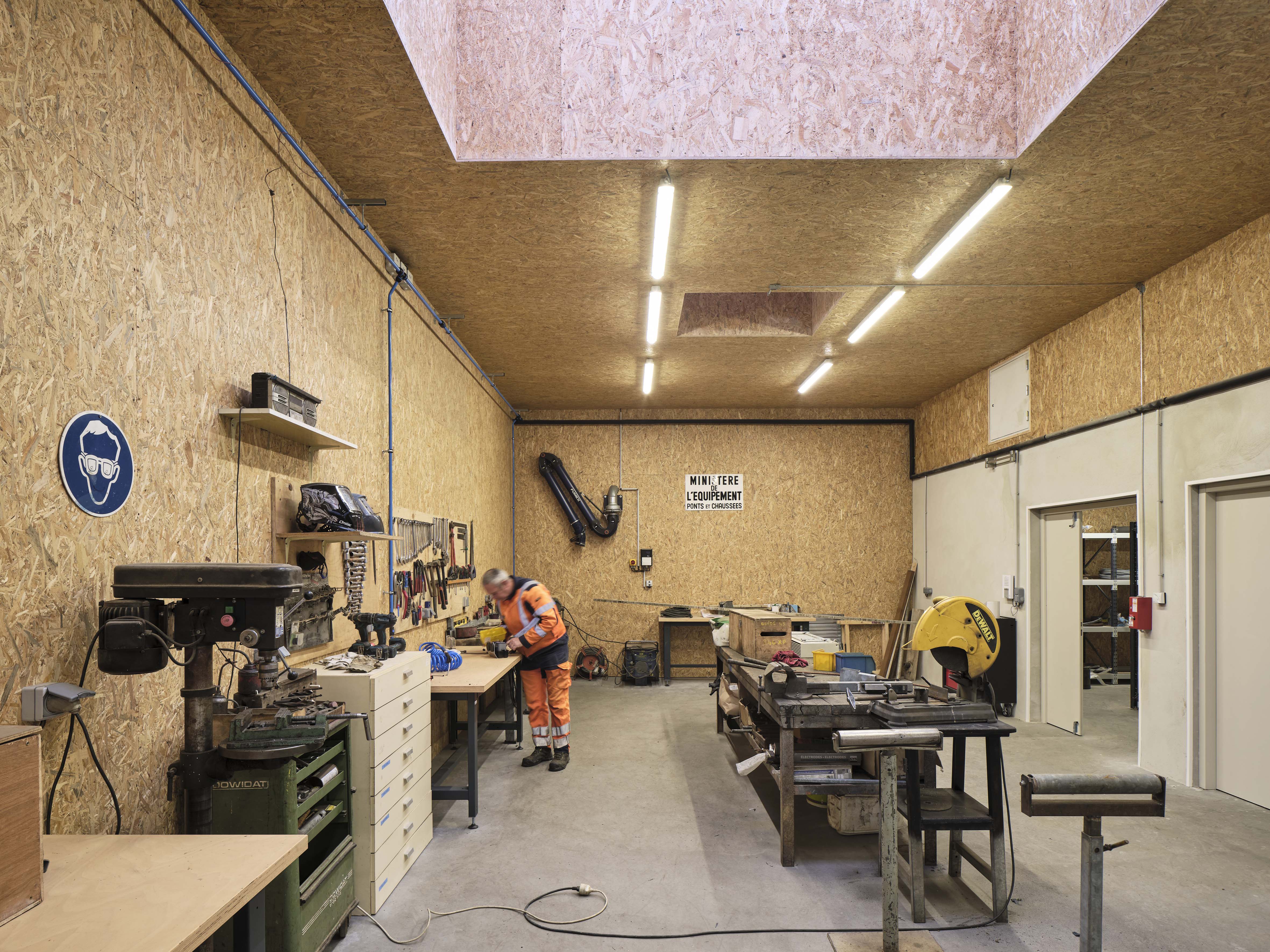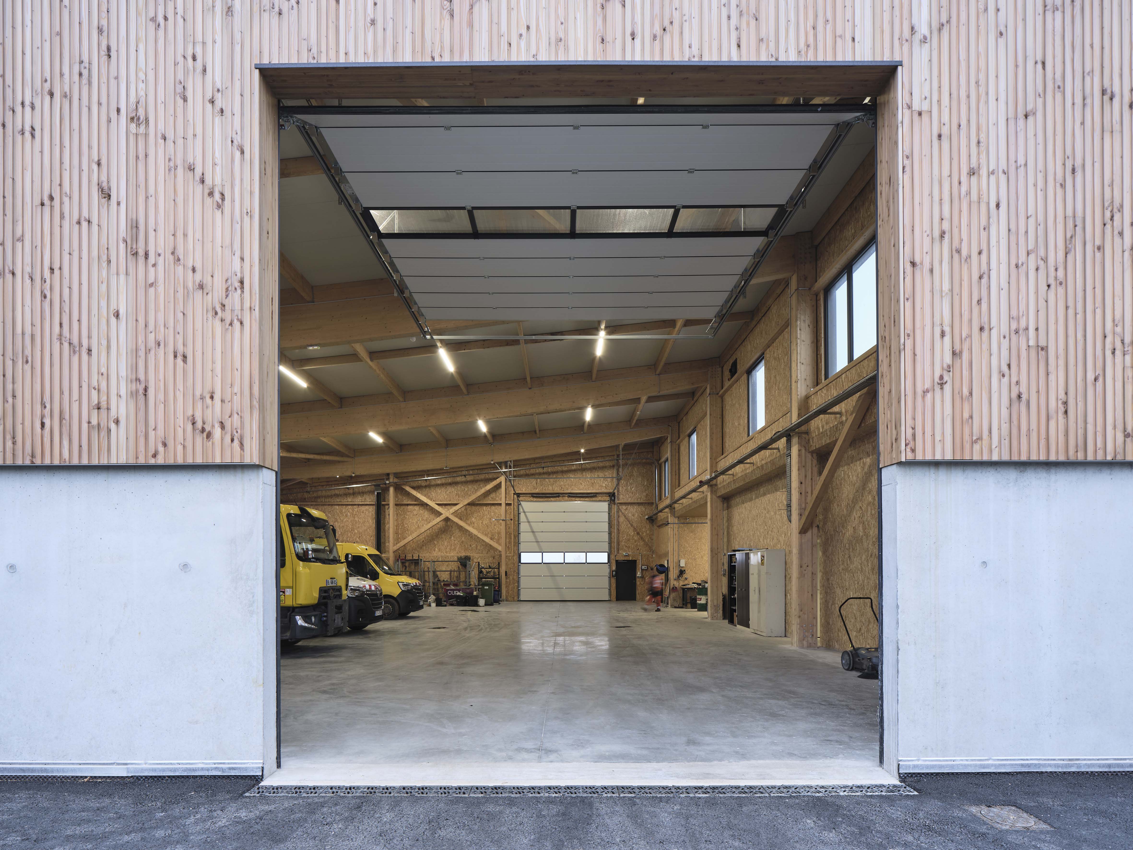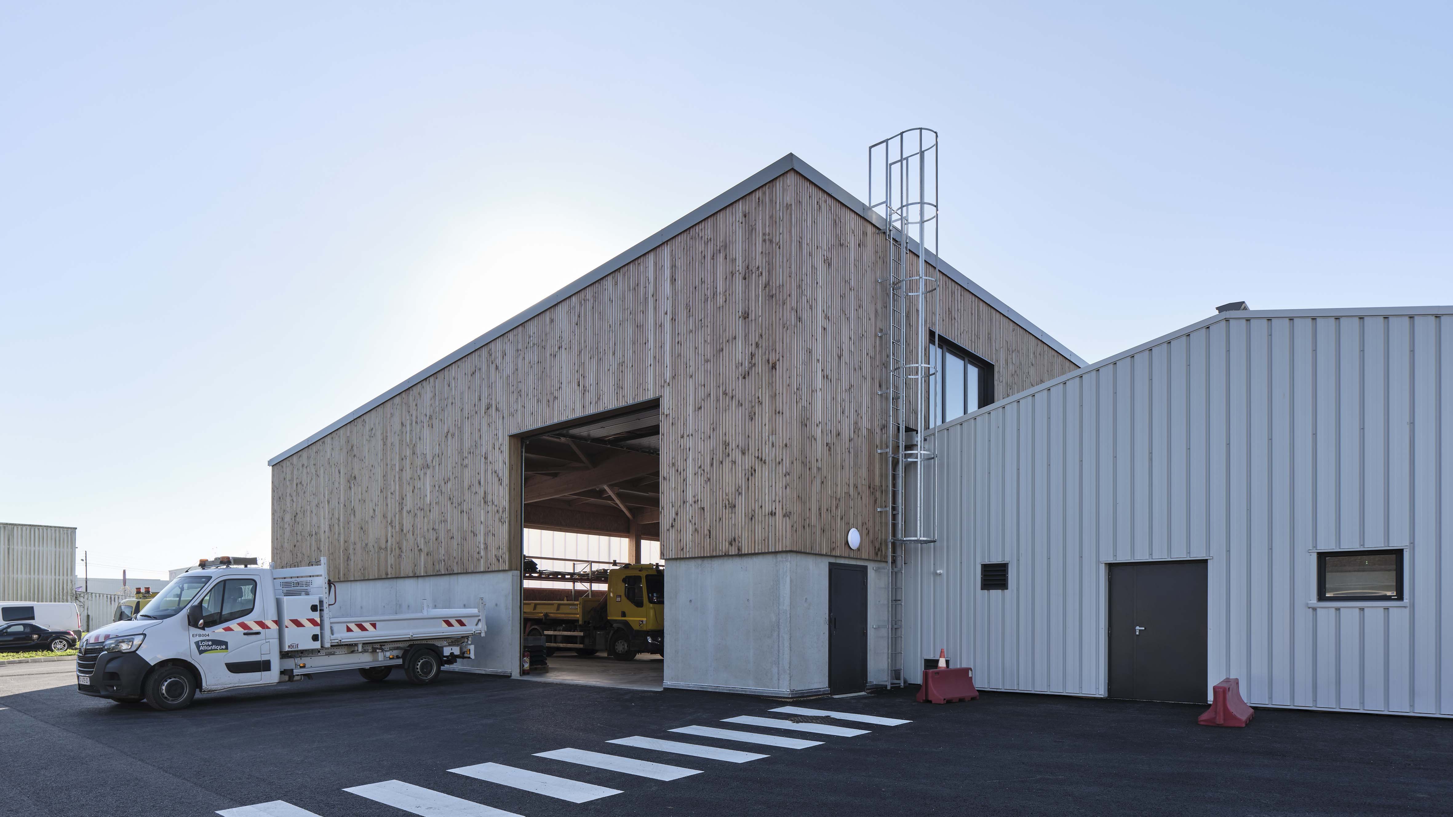 Le CIR occupe la totalité des locaux existants de la DDE réhabilités et nécessite une extension pour accueillir tous les véhicules et les équipements des services. Pour réduire les couts de l’opération, une réorganisation complète du site est réalisée en préservant les ouvrages utiles et pérennes en cohérence avec le fonctionnement des agents. La couverture amiantée est remplacée et une résine est appliquée sur les sols existants pour accueillir des véhicules et du stockage. Une boite isolée et chauffée en bois est créée sous cette halle pour les ateliers. Une extension traversante accolée à l’existant complète les besoins. Isolée et éclairée naturellement, elle facilite le travail des agents. Bardée de bois sur un soubassement en béton, la toiture est couverte de panneaux photovoltaïques, une cuve EP étant implantée sur le site.