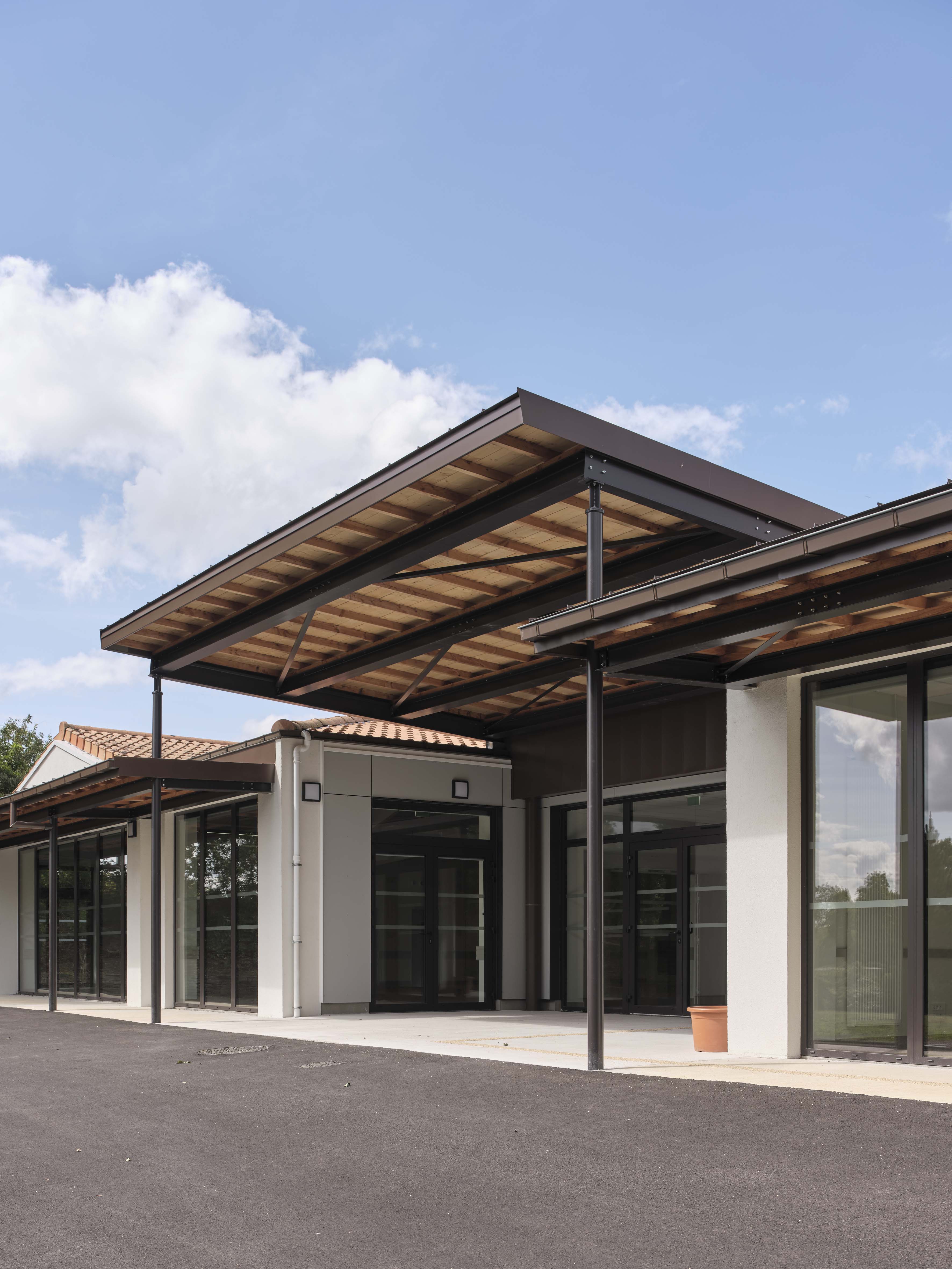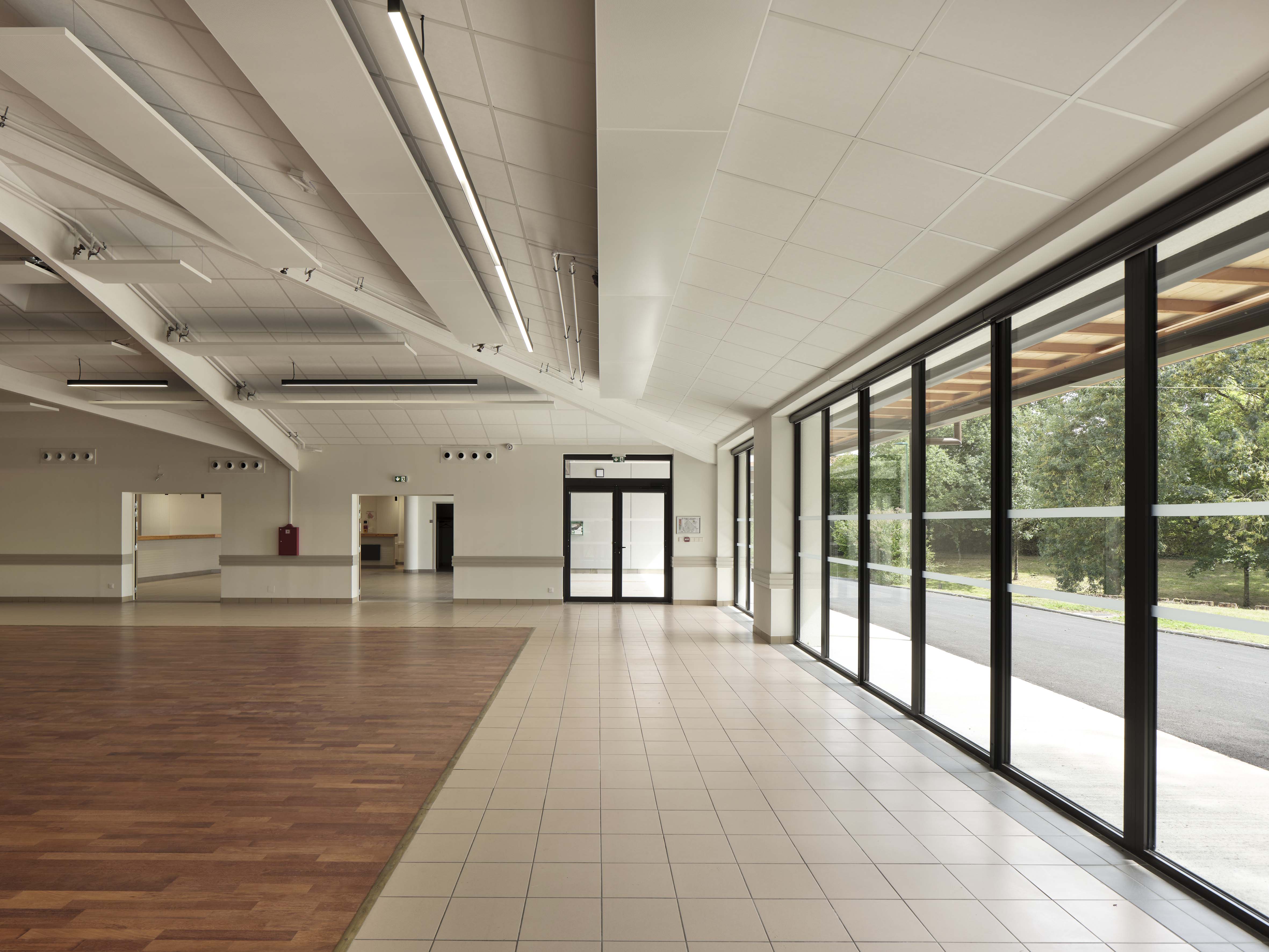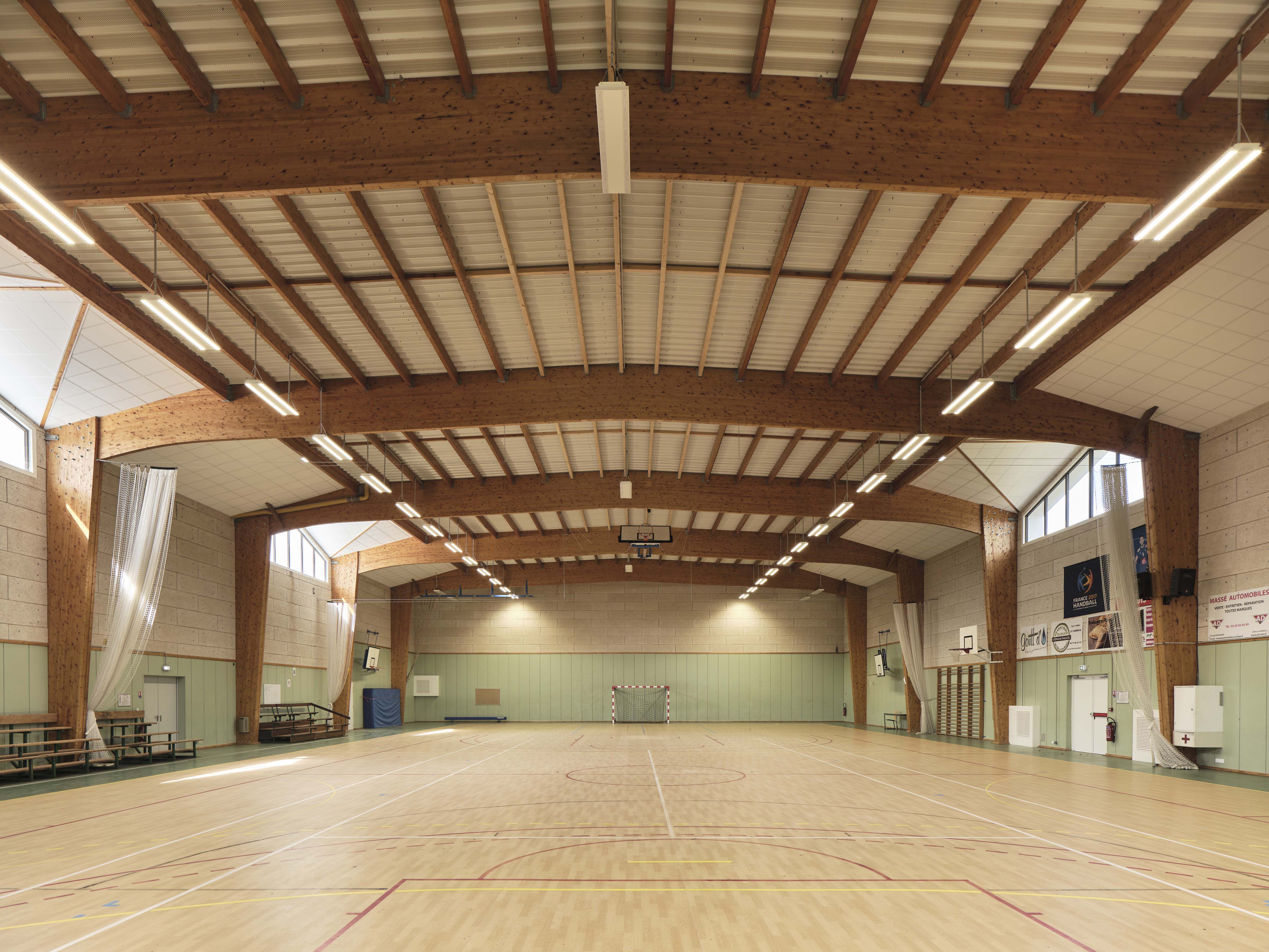 Le projet de rénovation énergétique du Complexe des Nouëlles (salle polyvalente et salle de sports) répond à plusieurs enjeux (amélioration thermique en hiver et en été, mise en conformité accessibilité, mise en conformité sécurité incendie, remplacement de la cuisine par un office, création de locaux de rangements). Pour répondre à ces enjeux, un ITE est réalisé sur l’ensemble des parois, les menuiseries extérieures sont changées et l’isolation des couvertures est renforcée impliquant des renforcements structurels. Cet embellissement des façades est renforcé par l’installation d’une casquette protégeant les façades sud et marquent les entrées. Une géothermie et une centrale double flux sont installées pour le chauffage (panneaux rayonnants) et la ventilation des locaux permettant un rafraichissement en été.