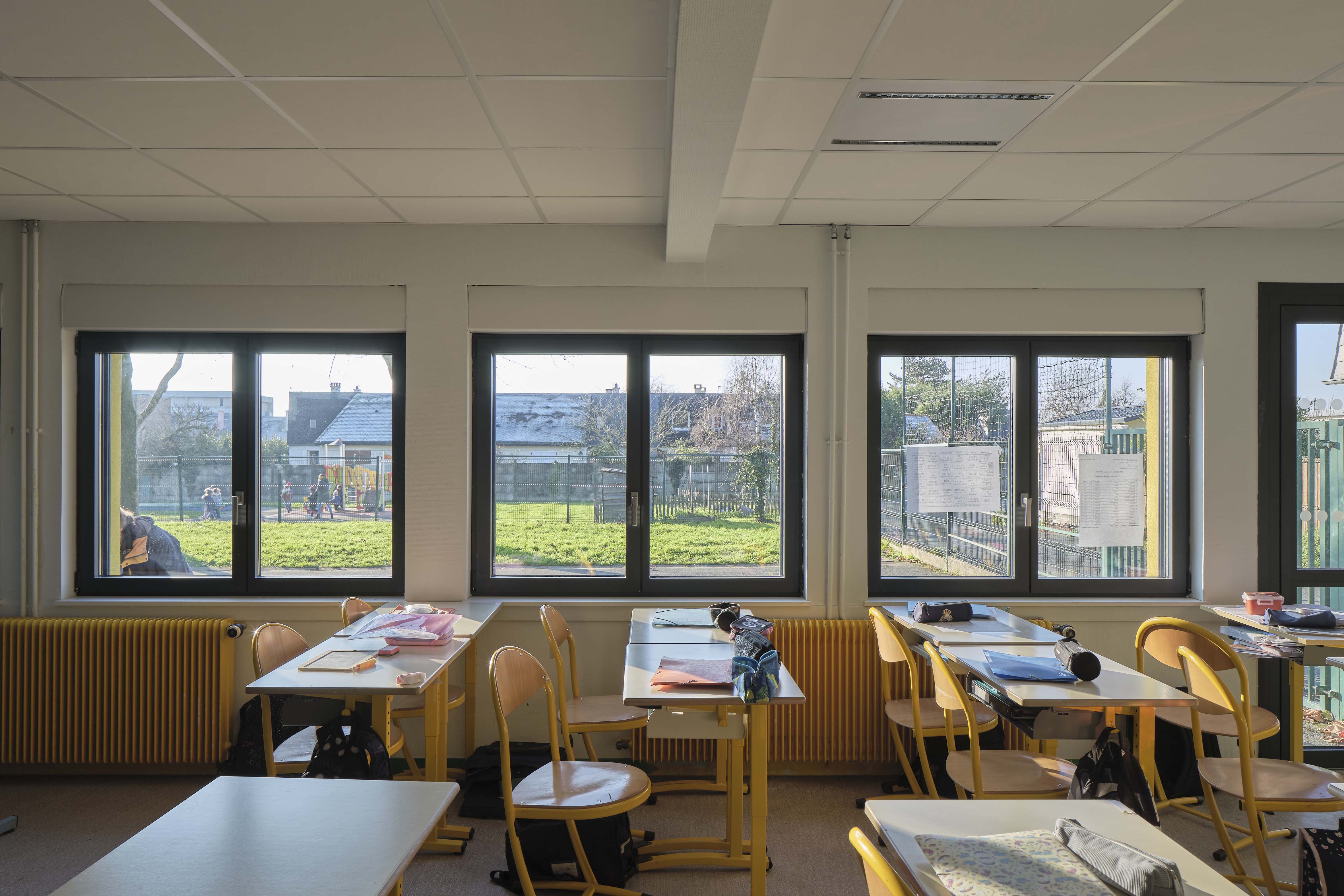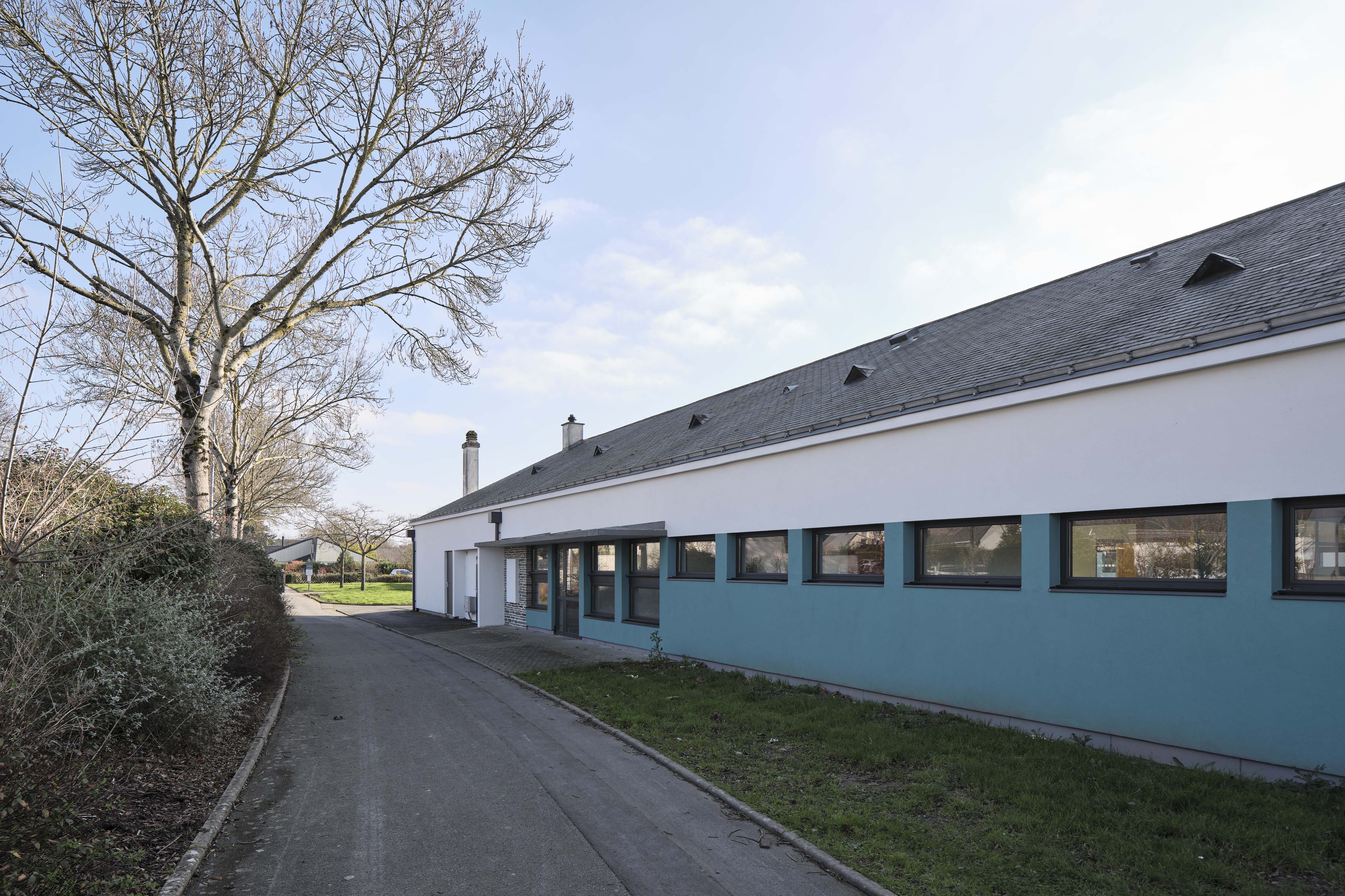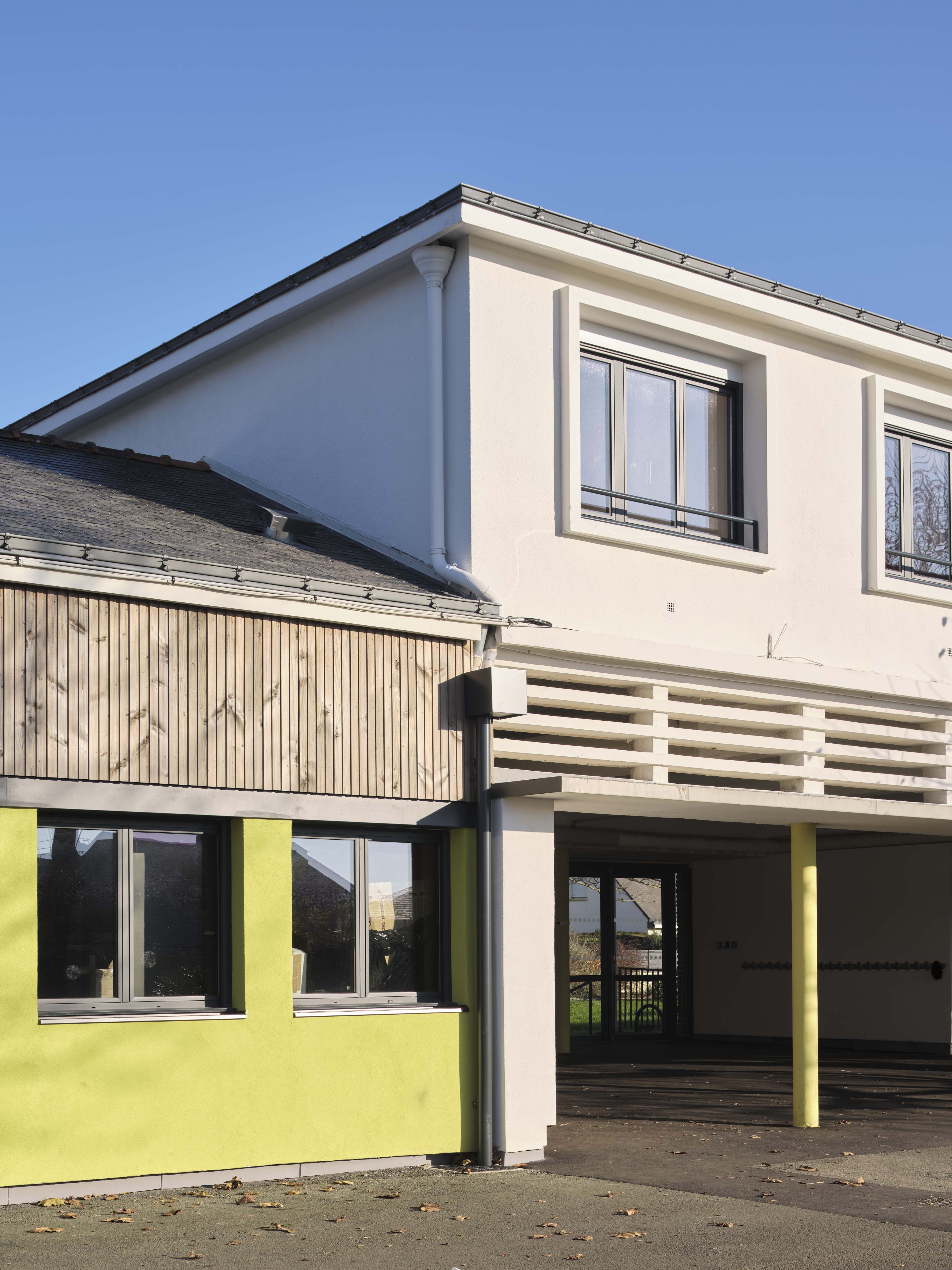 - Thermique : le projet s’inscrit dans une démarche globale de rénovation énergétique des bâtiments scolaires. Il prévoit à la fois une isolation de l’enveloppe avec emploi de matériaux biosourcés (ITE, isolation des combles, remplacement de l’ensemble des menuiseries extérieures) mais également Ie changement des équipements techniques (remplacement des éclairages, mise en place d’une ventilation double flux, changement de la chaudière gaz par une PAC air/eau). Le projet met au profit cette rénovation thermique pour revaloriser les façades et embellir l’école.