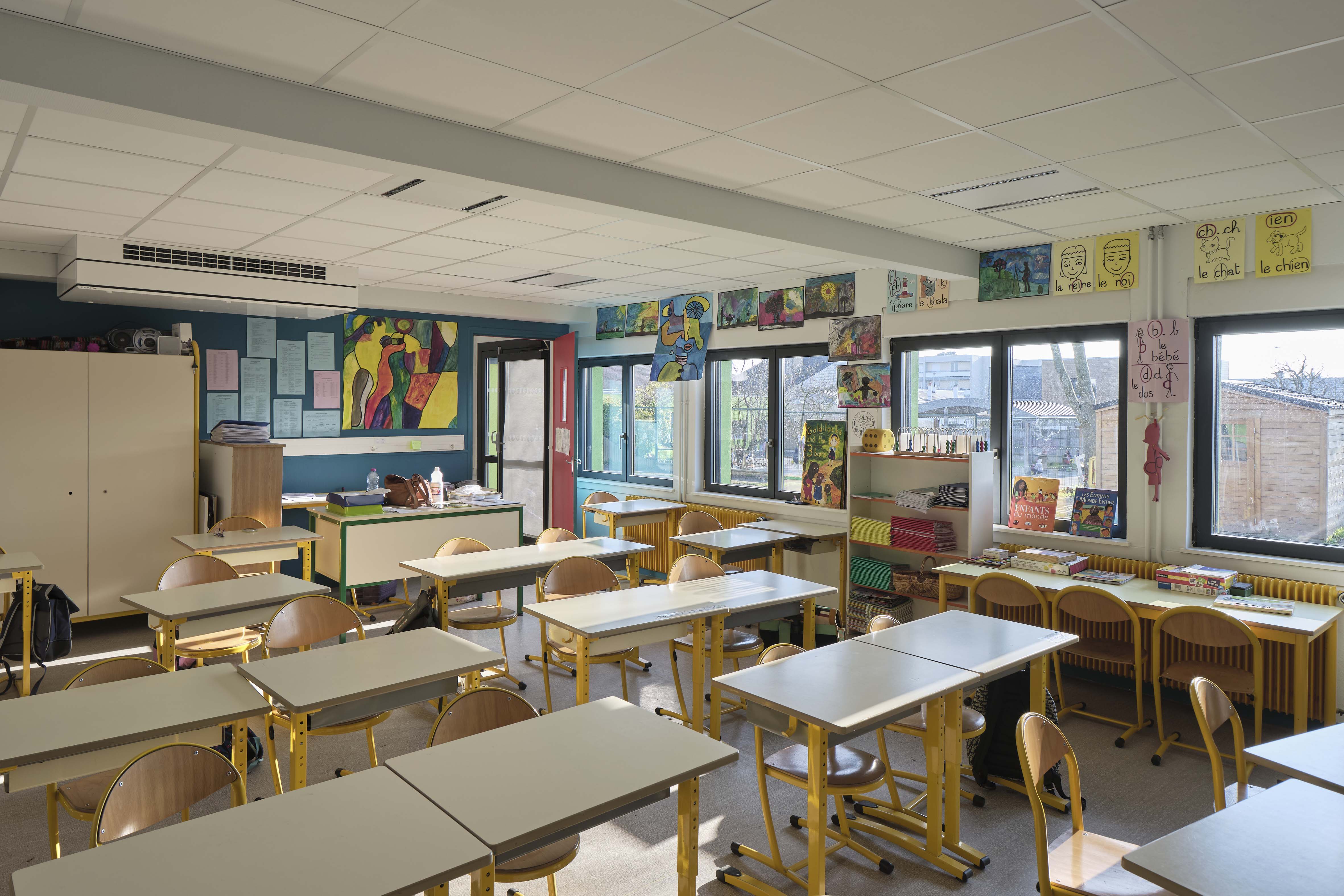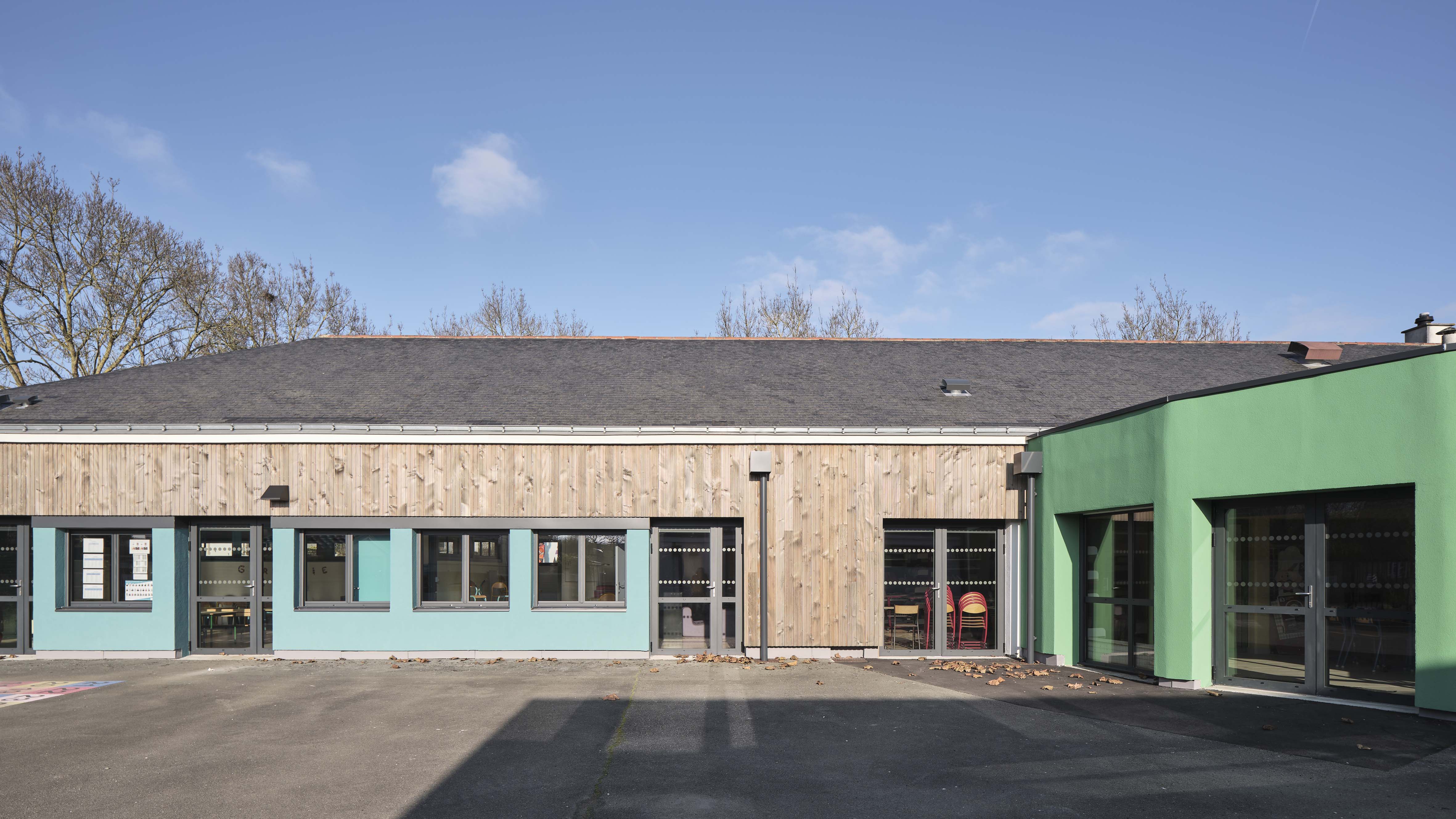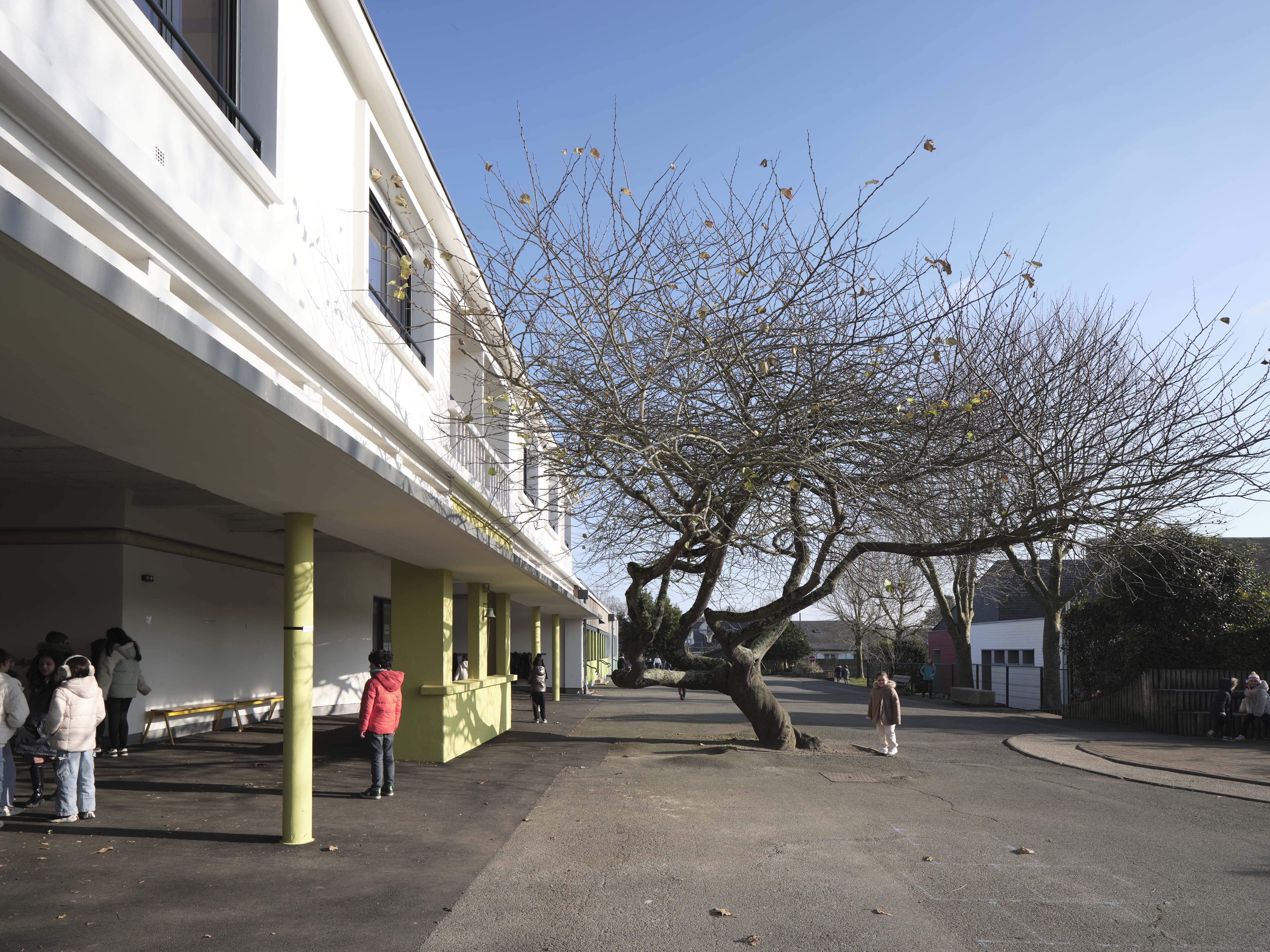 - Thermique : le projet s’inscrit dans une démarche globale de rénovation énergétique des bâtiments scolaires. Il prévoit à la fois une isolation de l’enveloppe avec emploi de matériaux biosourcés (ITE, isolation des combles, remplacement de l’ensemble des menuiseries extérieures) mais également Ie changement des équipements techniques (remplacement des éclairages, mise en place d’une ventilation double flux, changement de la chaudière gaz par une PAC air/eau). Le projet met au profit cette rénovation thermique pour revaloriser les façades et embellir l’école.