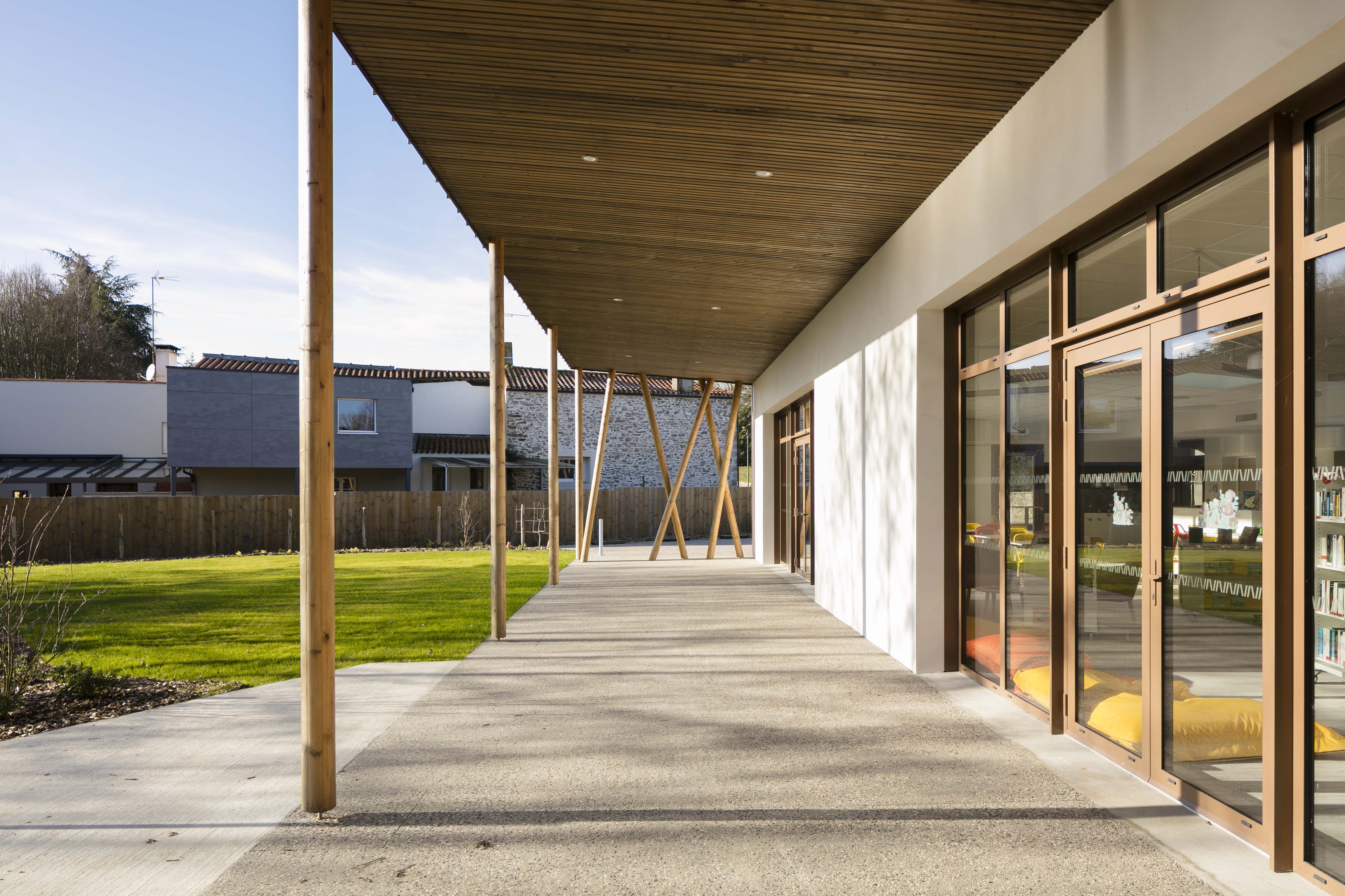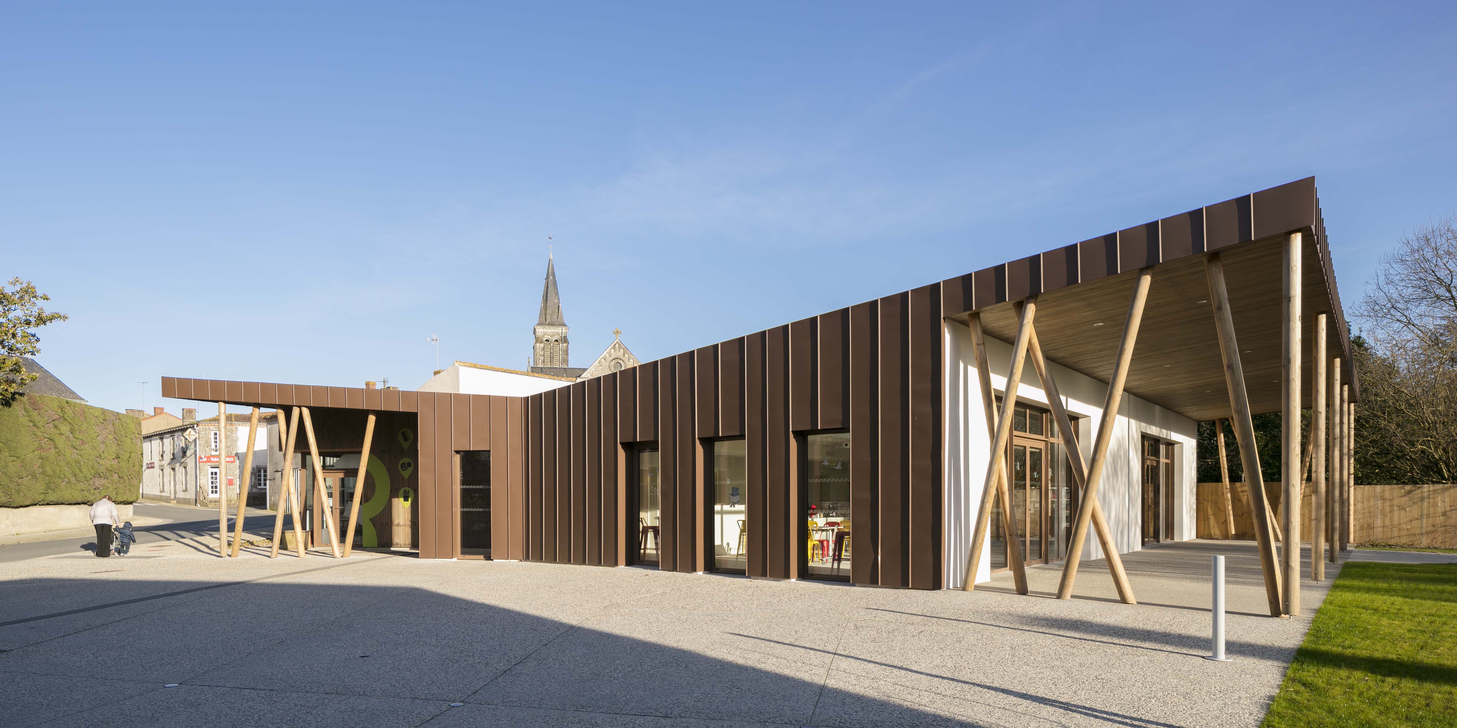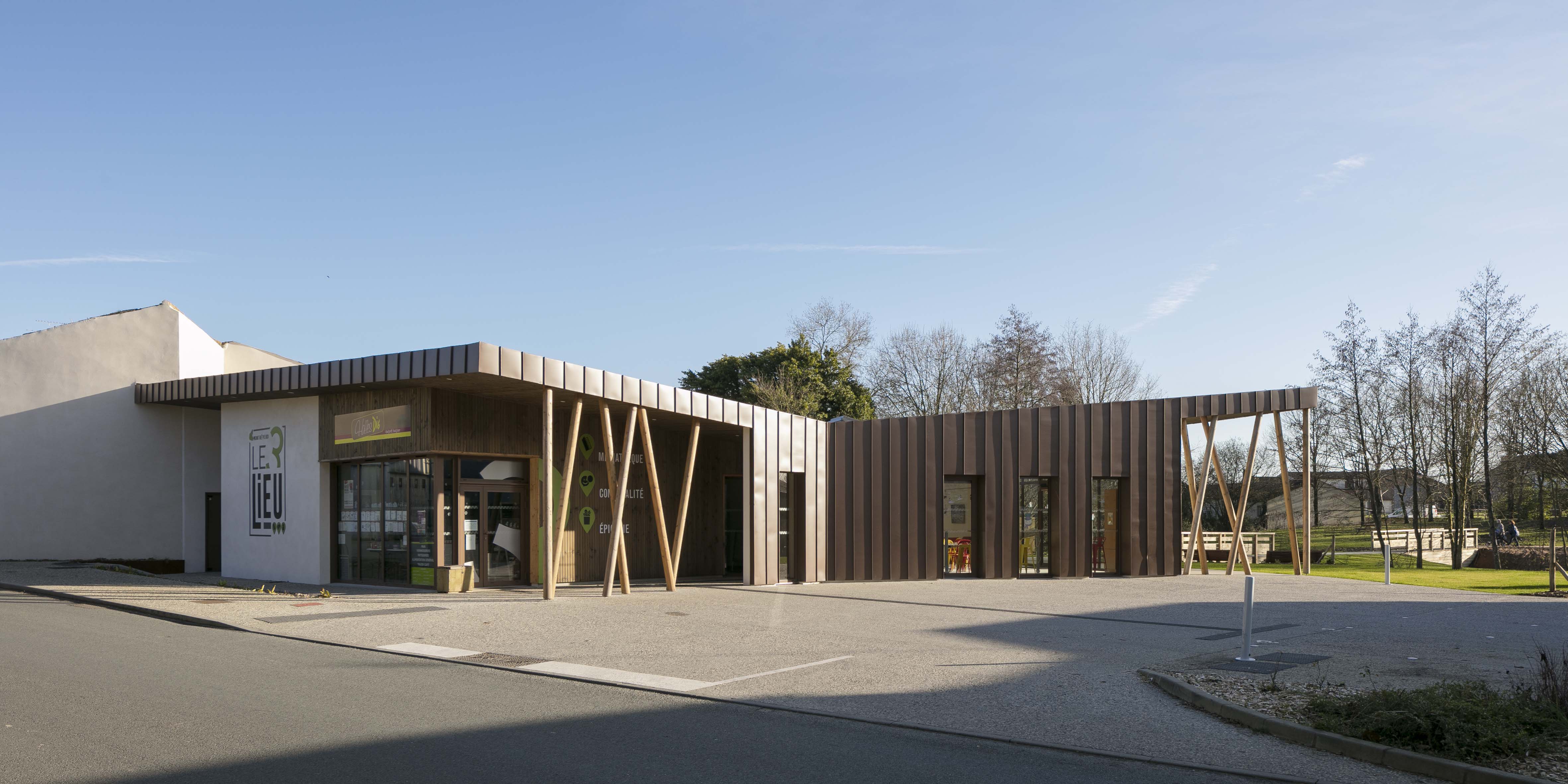 Ce bâtiment public construit pour revitaliser le centre bourg de Mormaison accueille un commerce, une bibliothèque et un lieu de convivialité où se retrouvent toutes les générations. Situé en proue du bâtiment, le commerce crée un front bâti en continuité du tissu urbain alors que la bibliothèque et la salle de convivialité s’ouvrent vers la rivière et son espace boisé. Son architecture contemporaine dominée par le zinc marron s’harmonise avec les murs en pierre, la tuile et l’espace vert du site.
